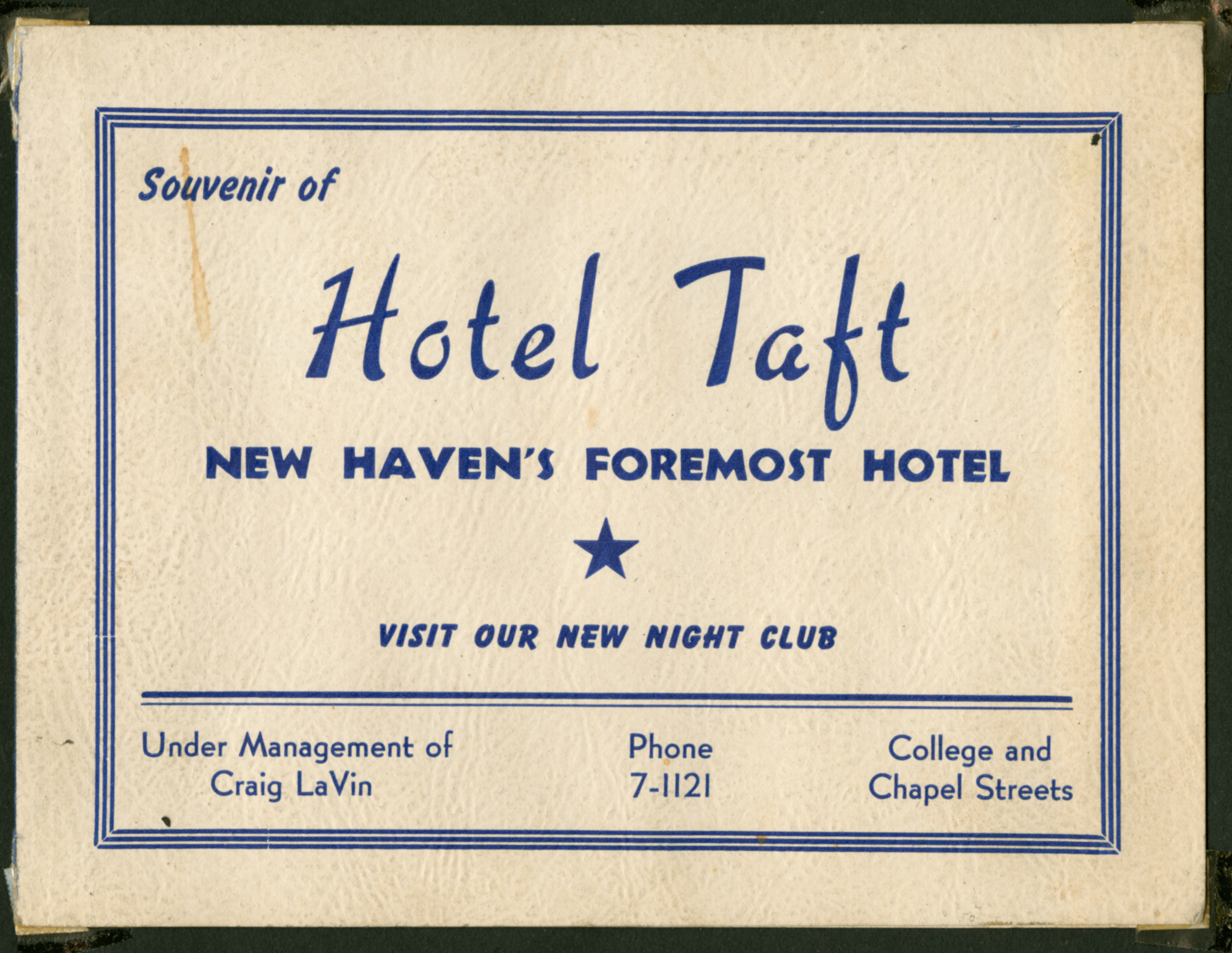 Folder is off-white with blue text: "Souvenir of Hotel Taft; New Haven's Foremost Hotel; *; Visit Our New Night Club; Under Management of Craig La Vin, Phone 7-1121, College and Chapel Streets"