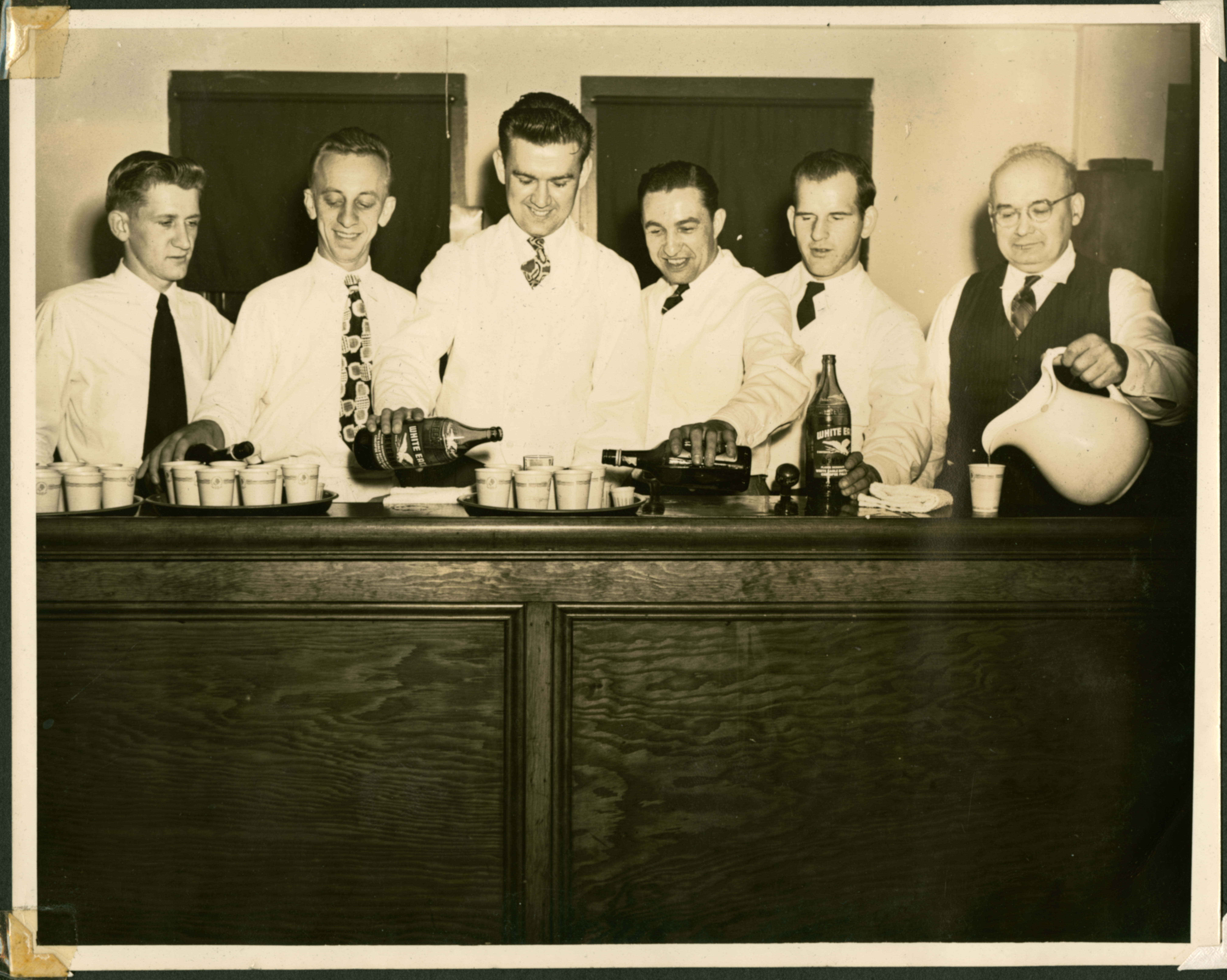 A large photograph of six men behind a counter. The men are pouring White Eagle into paper cups that are on trays. The first five men are wearing white shirts and some white vests, and the older man in glasses on the right is wearing a dark vest and puring what appears to be a pitcher of water. Edmund may be pictured center, pouring one of the bottles.