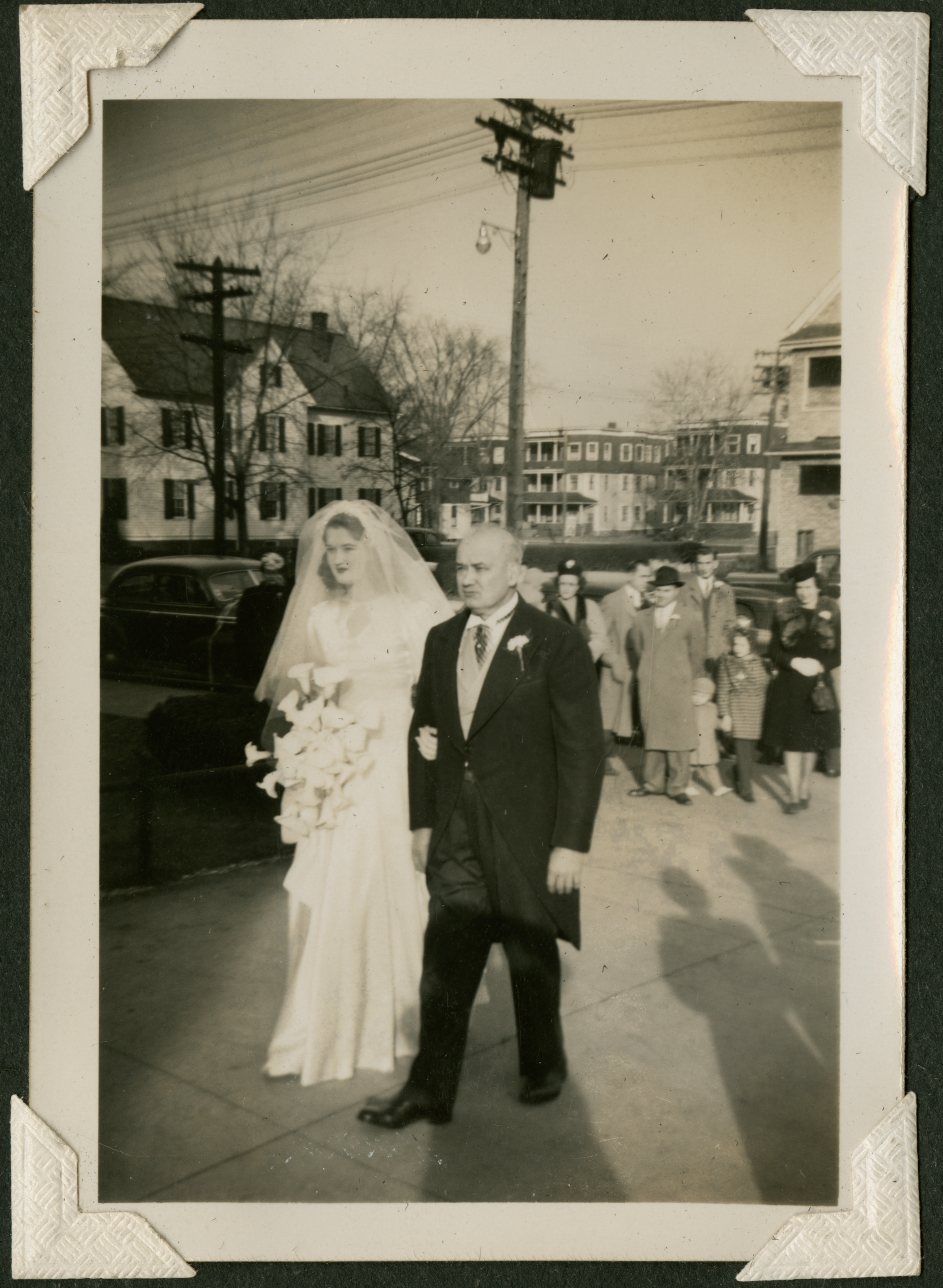 A woman in a wedding gown holding a bouquet, holding the arm of an older man (perhaps her father) in a suit, walking together on a sidwalk. A crowd of people can be seen in the background, near parked cars and in front of houses and telephone poles. 024 is printed in black ink on the back of the photograph.