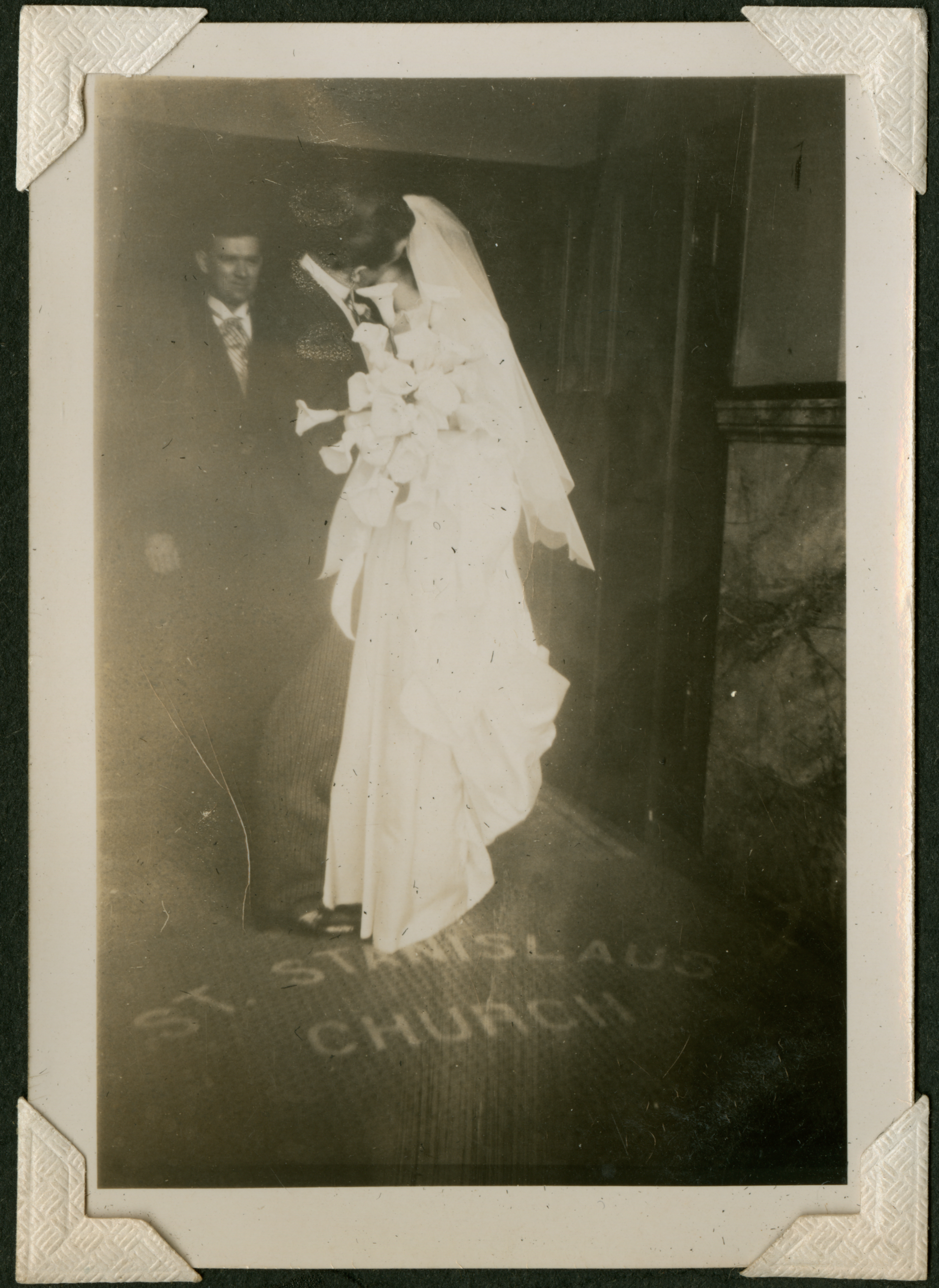 A man in a suit and a woman in a wedding gown kissing in a doorway, faces obscured. A man in a suit is behind them in the doorway, and the floor in front of them has the words "St. Stanislaus Church" on it. 024 is printed in black ink on the back of the photograph.