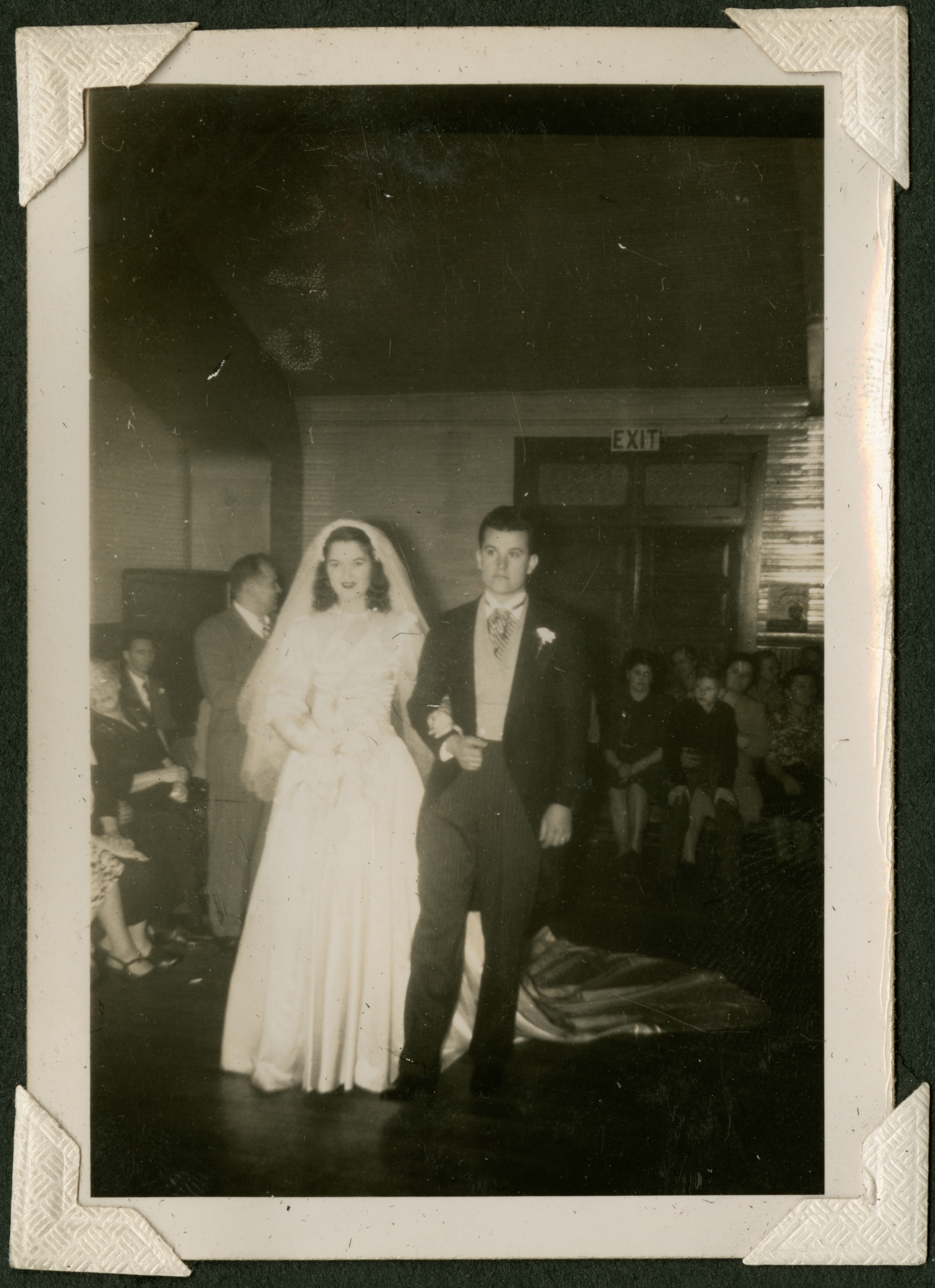 A woman in a wedding gown standing holding the arm of a man in a suit to her right. They are standing in the middle of an open floor with people around them, watching. 015 is printed in black ink on the back of the photograph.