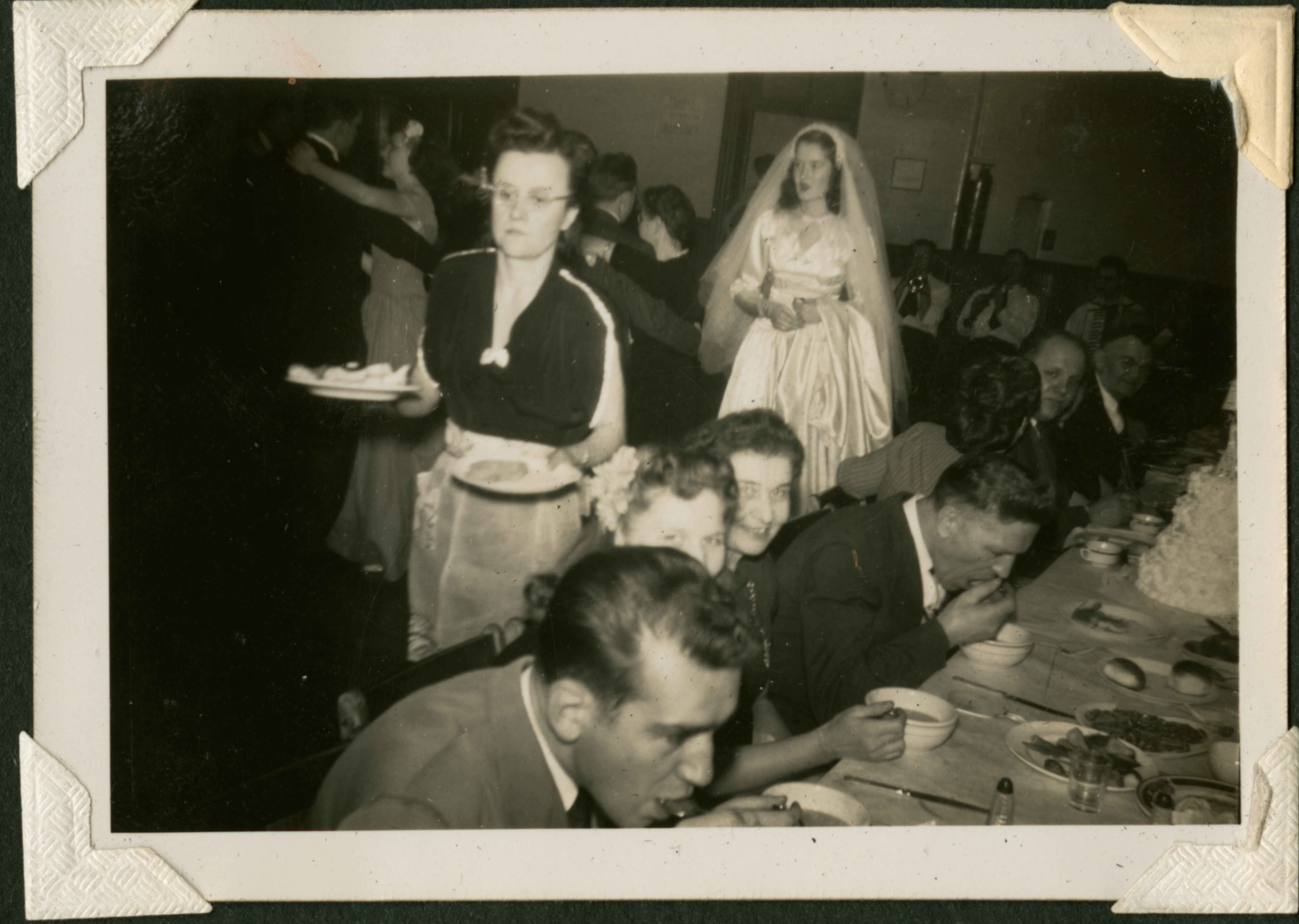 A photograph of dinner being served during a wedding reception. The bride is standing, walking past the table, and a server is carrying plates. A couple is dancing in the background. 015 is printed in black ink on the back of the photograph.