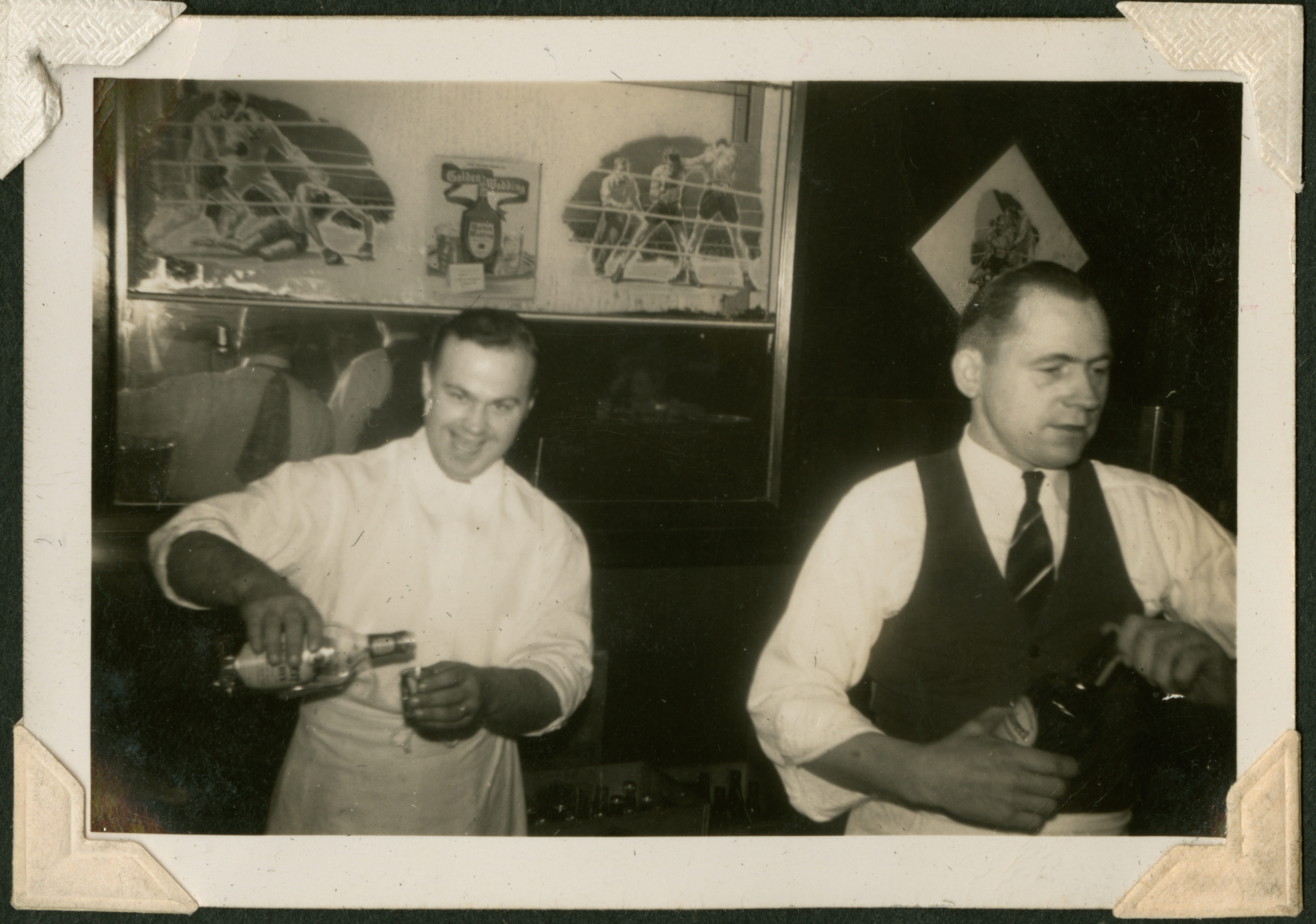 Two men, dressed as waitstaff, in the process of pouring drinks. On the wall behind them appears to be boxing posters. 015 is printed in black ink on the back of the photograph.