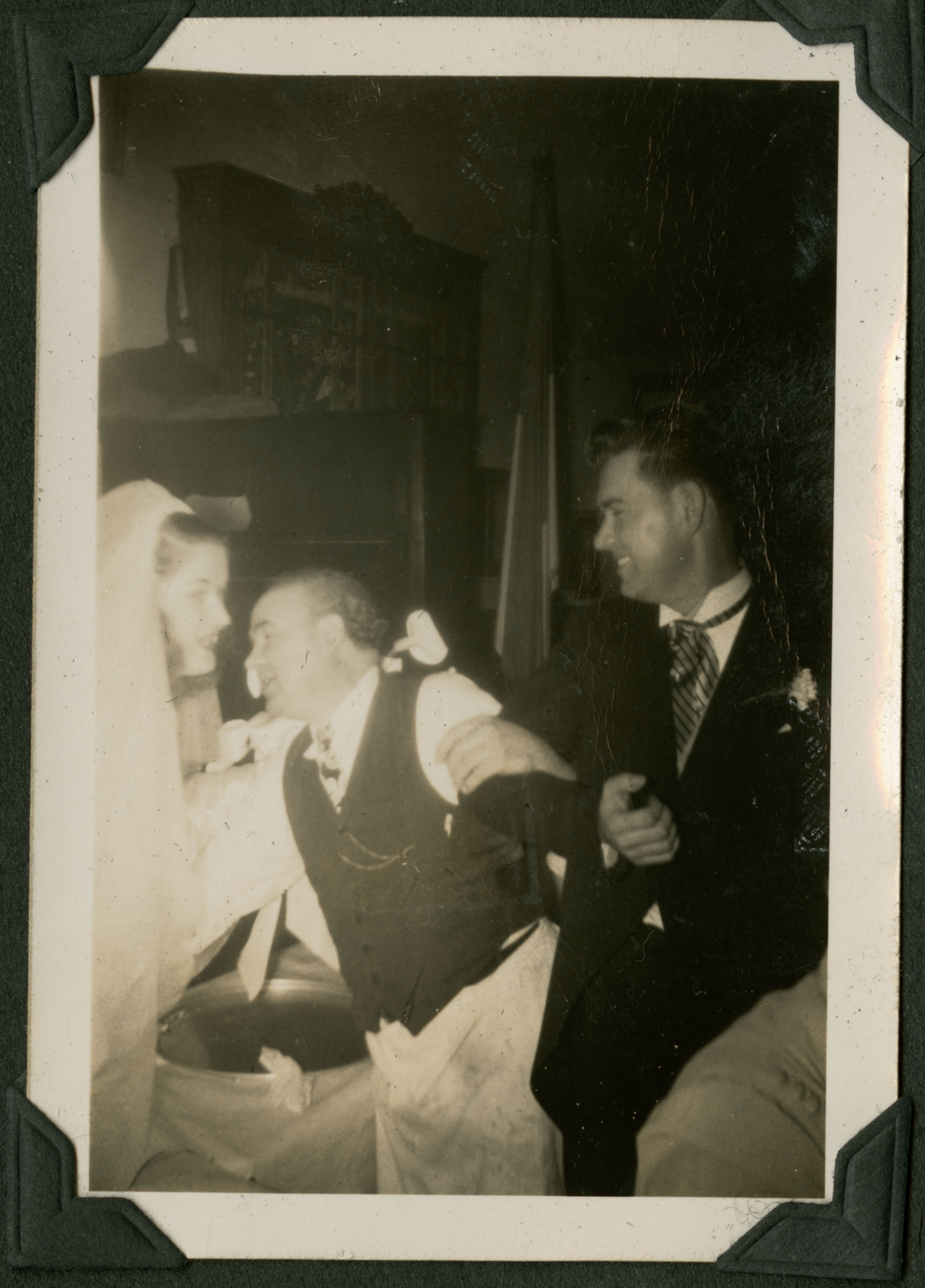 A close up of the bride as a man leans in and another man in a suit holds his arm as if dragging him away. 015 is printed in black ink on the back of the photograph.