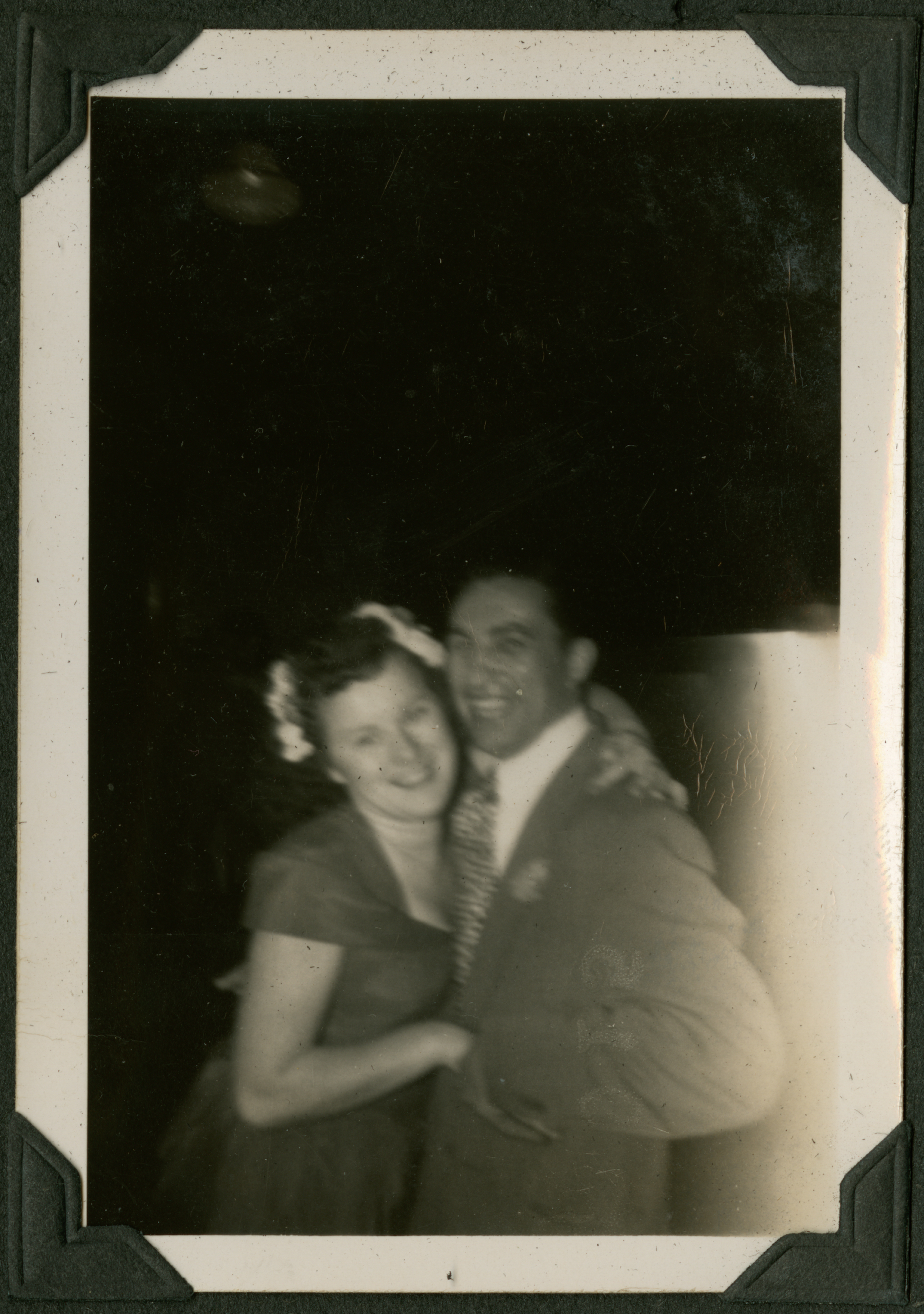 A blurry photograph of a smiling couple arm-in-arm, the woman (left) looking as if she is wearing a bridesmaid dress with flowers in her hair. 015 is printed in black ink on the back of the photograph.