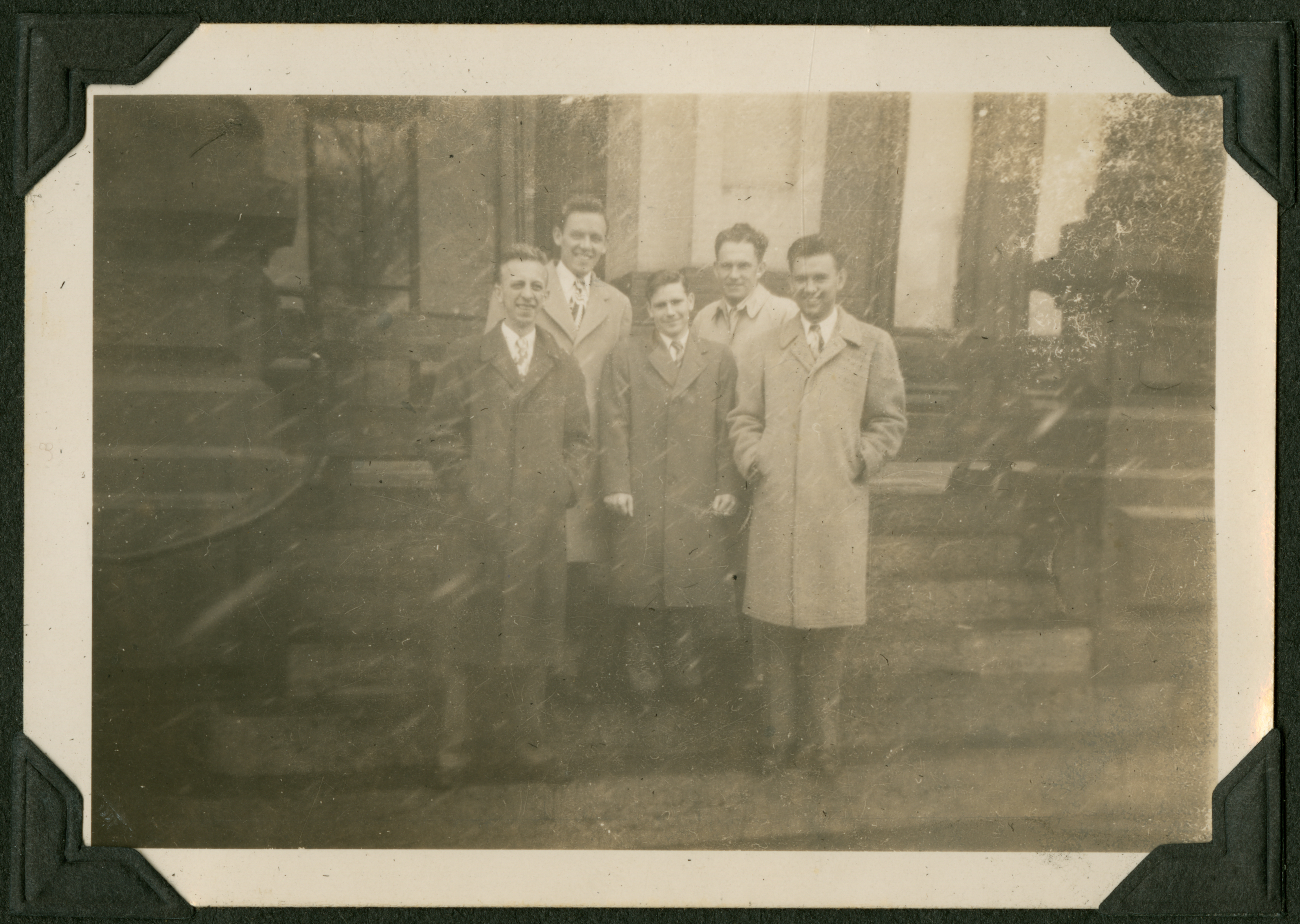 A group of five men in two rows (two in back and three in front) on the steps in front of a building. The man at the center of the bottom row has his hands to his sides while everyone else has their hands in the pockets of their coats. Edmund is on the bottom right. 025 is printed in black ink on the back of the photograph. This photograph is a slightly different angle of the same photograph above.