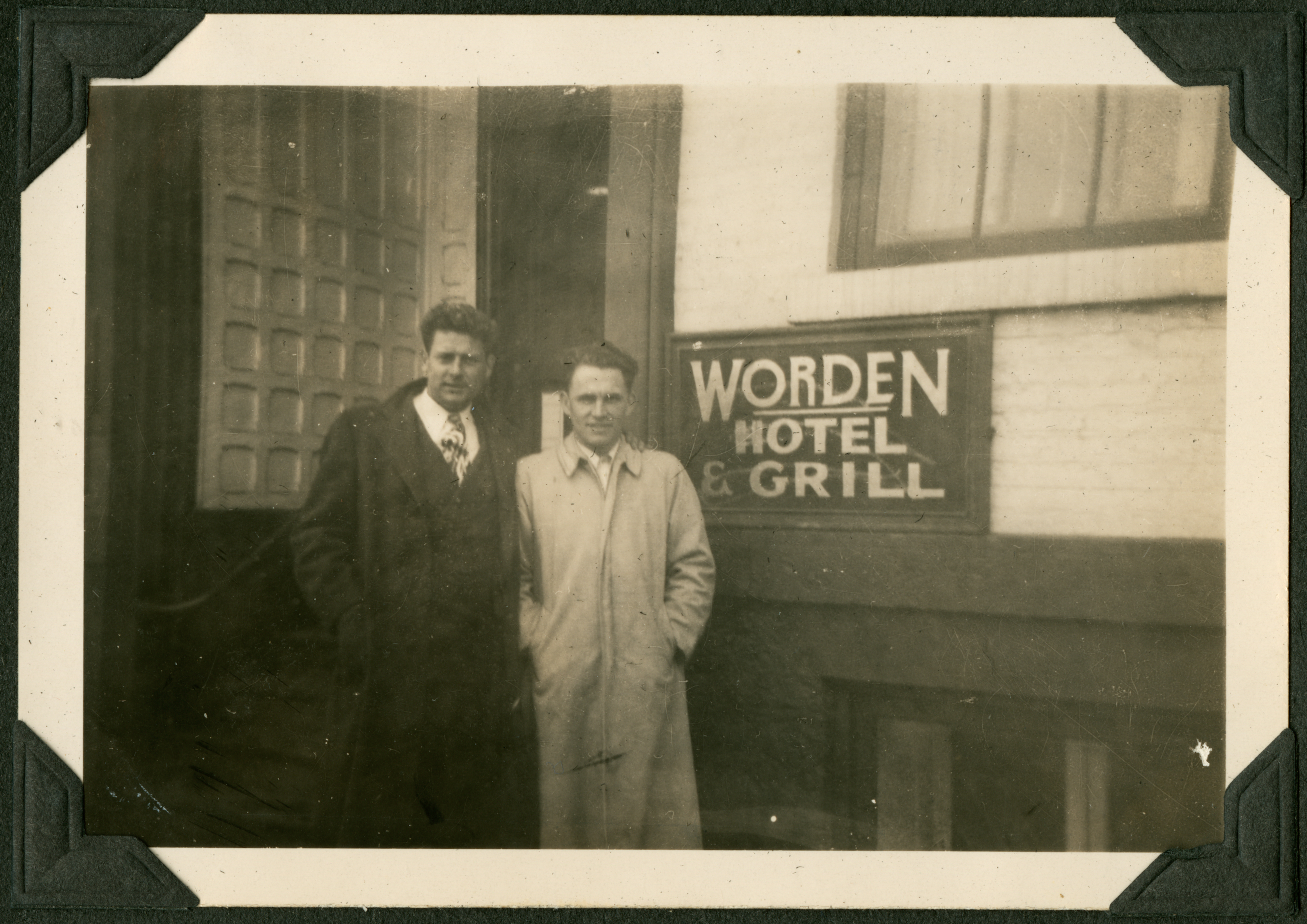 Two men in long coats standing outside a building. The man on the left is wearing a dark coat and the man on the right is wearing a lighter colored coat. They stand beside a sign on the building's wall that says "Worden Hotel & Grill." 025 is printed in black ink on the back of the photograph.