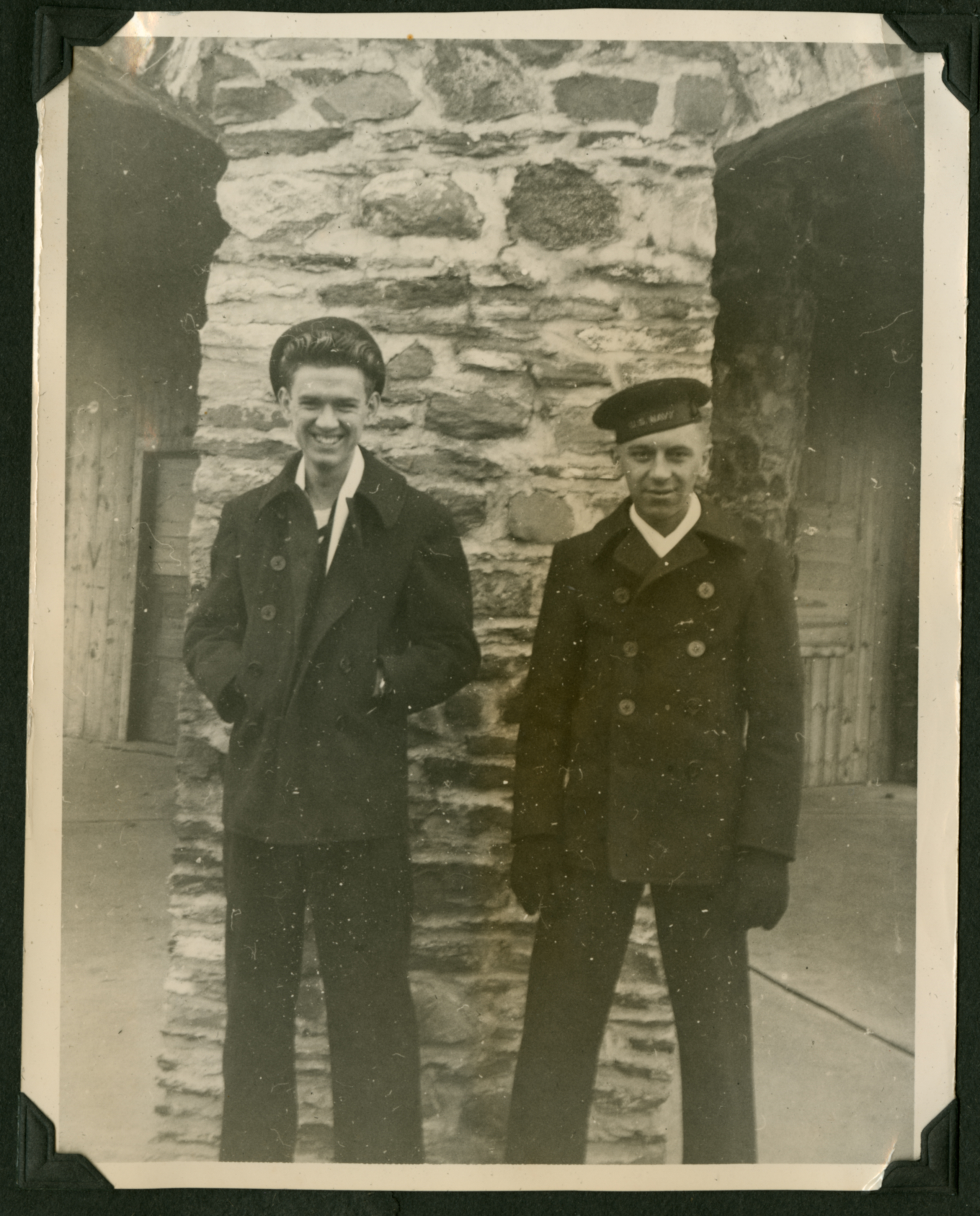 Two young men in naval uniforms and hats, with coats over them, standing against a stone pillar in front of a building. The man on the left (Edmund) has his hands in his coat pockets and is smiling towards the camera. The man on the right has his hands, covered in gloves, down towards his side and a more neutral expression on his face.