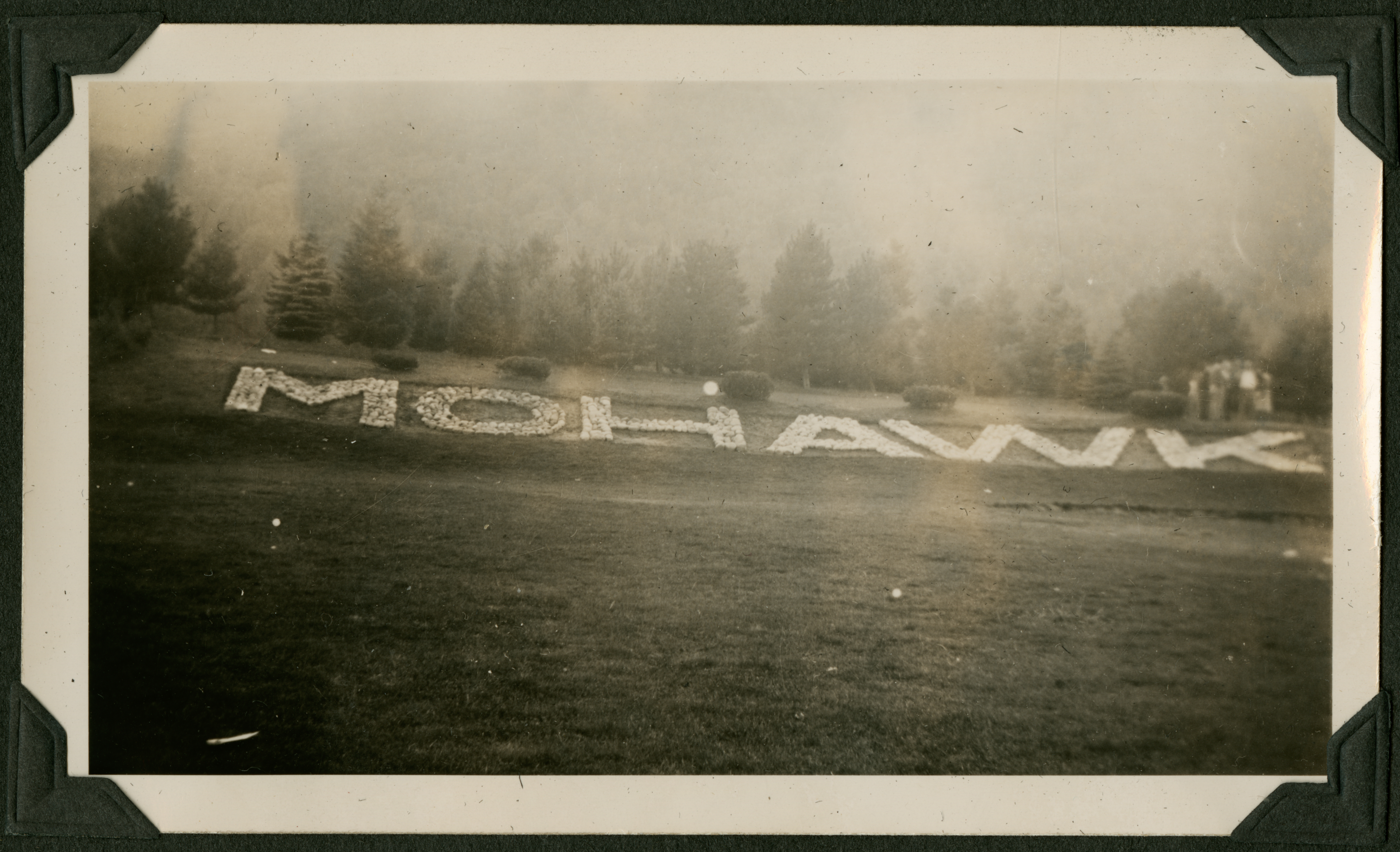 A photo of an open field with the word MOHAWK written in stone on it. There are trees in the background. 006K is printed in black ink on the back of the photograph. This is likely related to the Mohawk Trail Scenic Byway across northern Massachusetts.