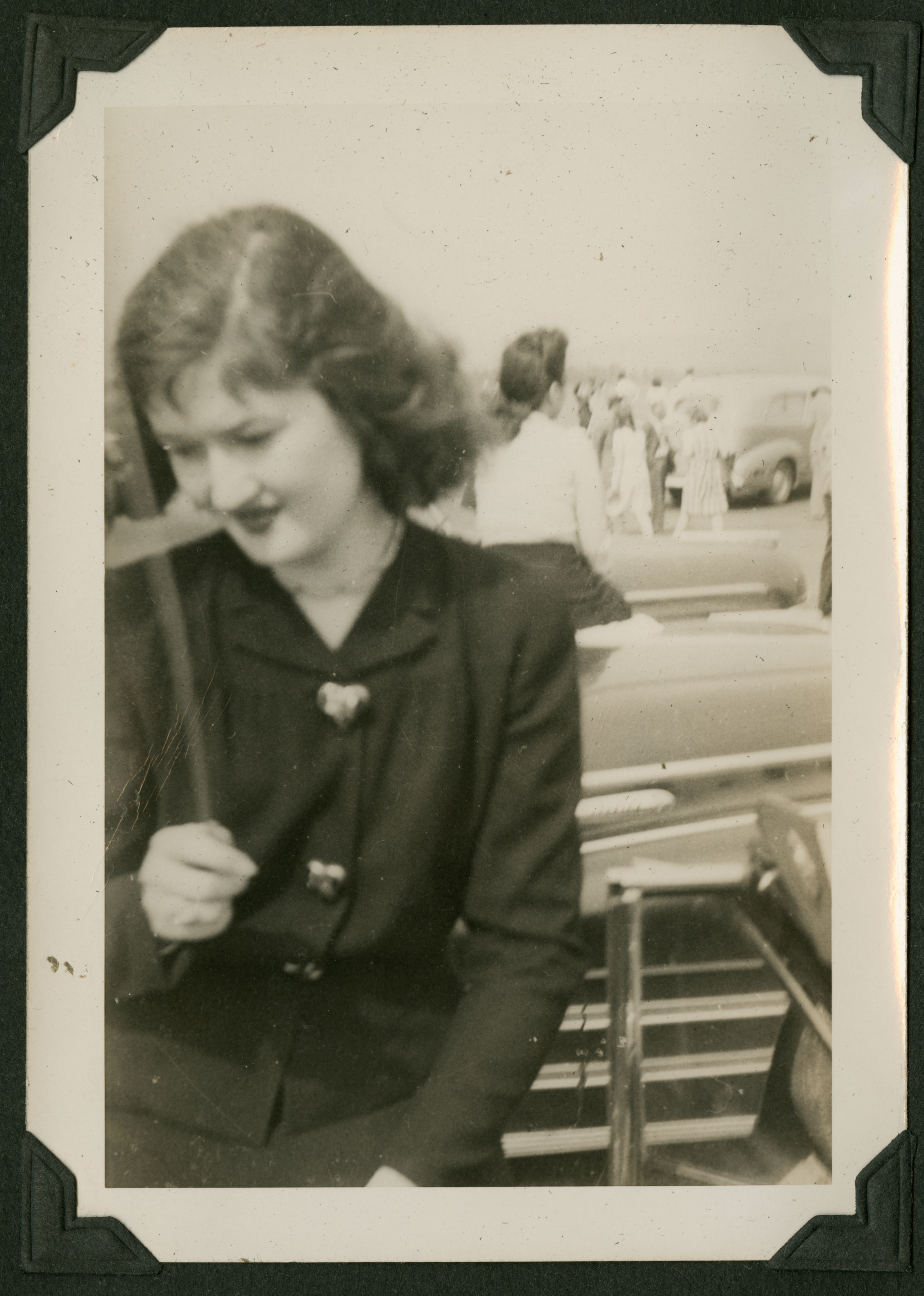 A young woman stands in front of a car. She is wearing a dark outfit, holding a string of what may be a balloon, and looks down towards the ground. A crowd of others and more cars is in the background behind her. 663 is printed in black ink on the back of the photograph.