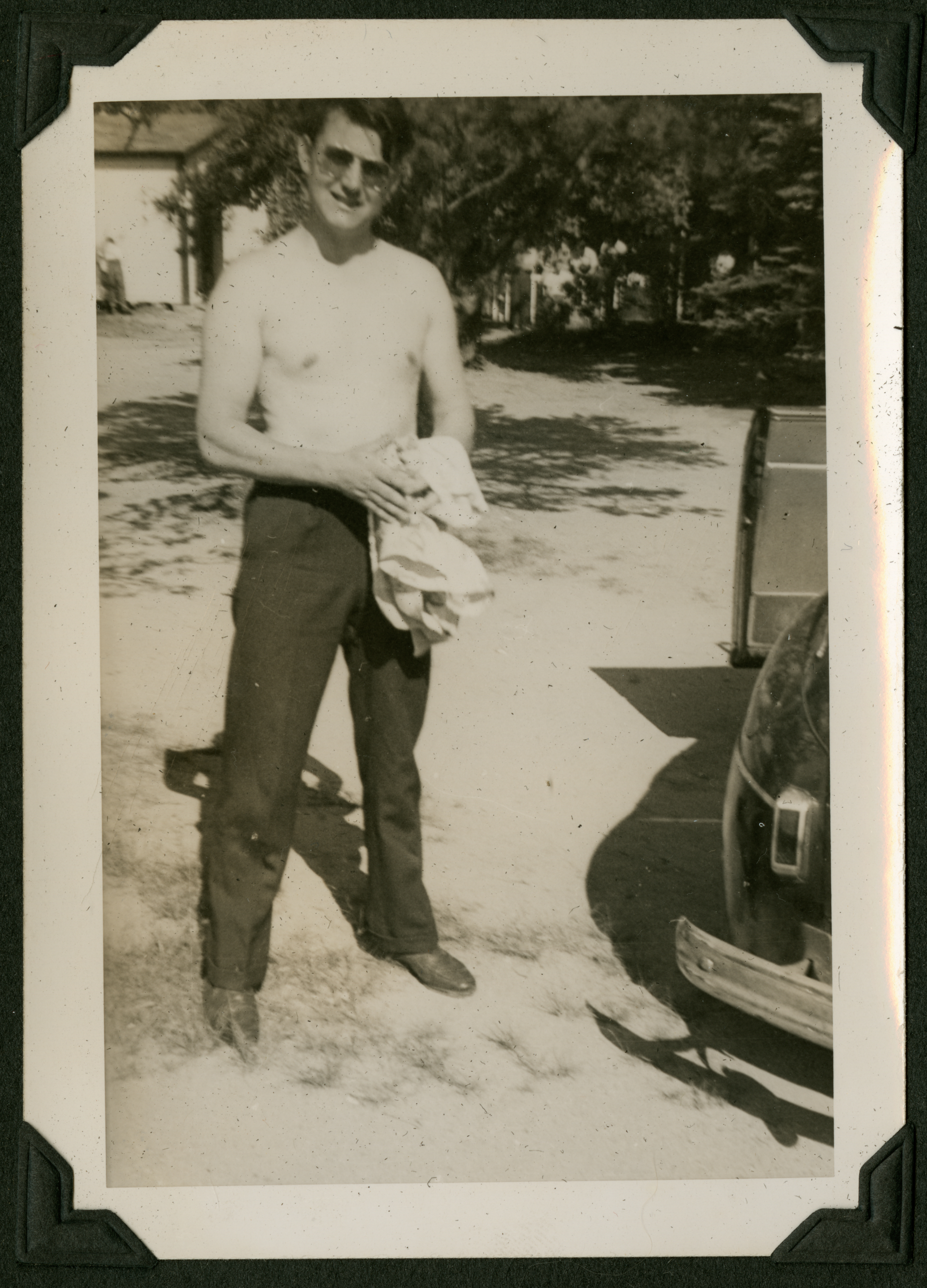 A shirtless man wearing sunglasses, black slacks, and shoes stands outside next to a car, holding his shirt in his hands. 663 is printed in black ink on the back of the photograph.