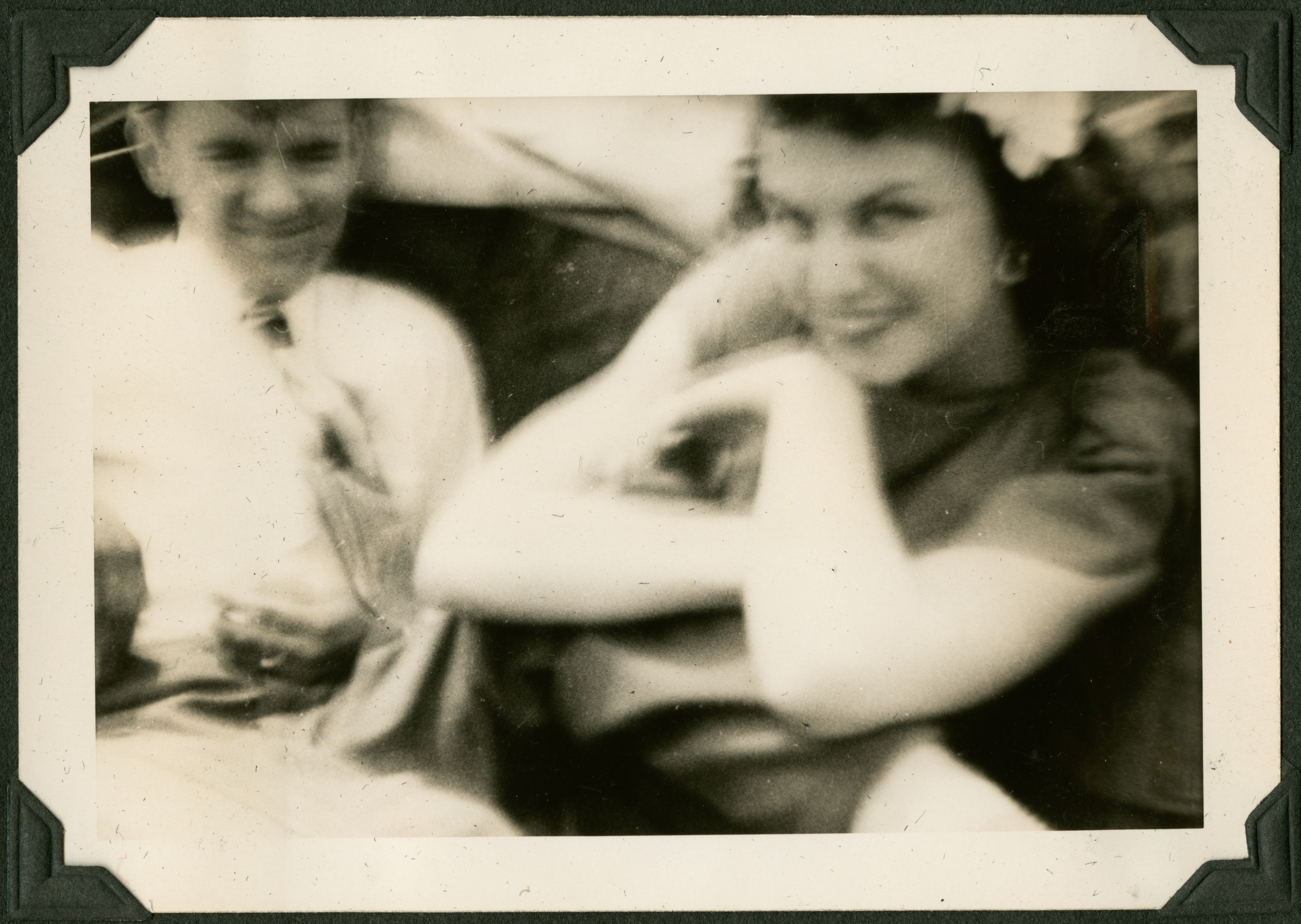 A blurry photograph of a man and a woman sitting next to each other. The man is wearing a white button down and tie, and the woman has a flower in her hair. She is smiling, head resting on her crossed arms. 663 is printed in black ink on the back of the photograph.