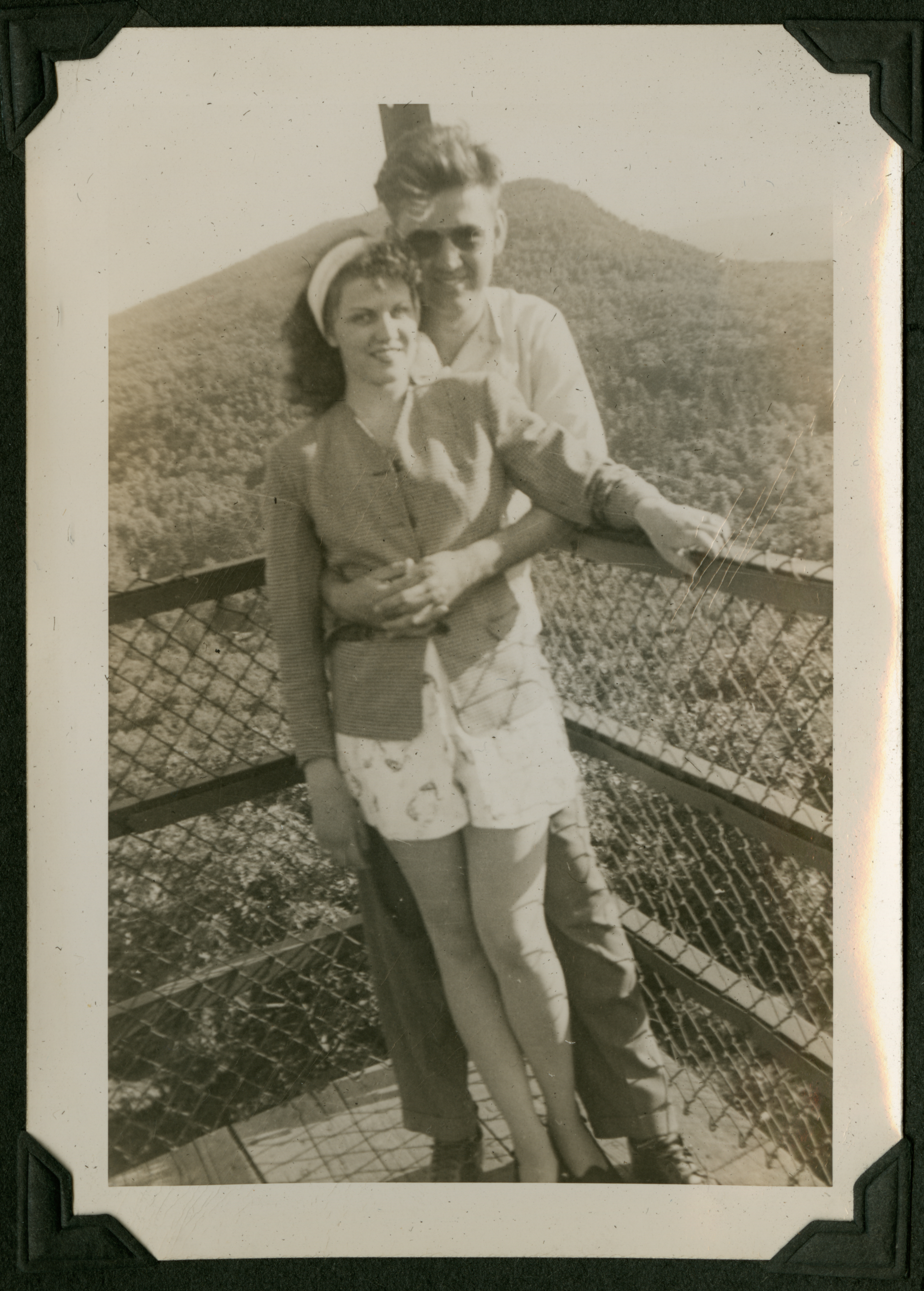 A young couple stands in front of what may be a fenced-in overlook site. The man (possibly Edmund) is wearing sunglasses and stands behind the woman, with his arms wrapped around her waist. She is wearing a white headband, a blazer and shorts. The background shows a forest of trees. 663 is printed in black ink on the back of the photograph.