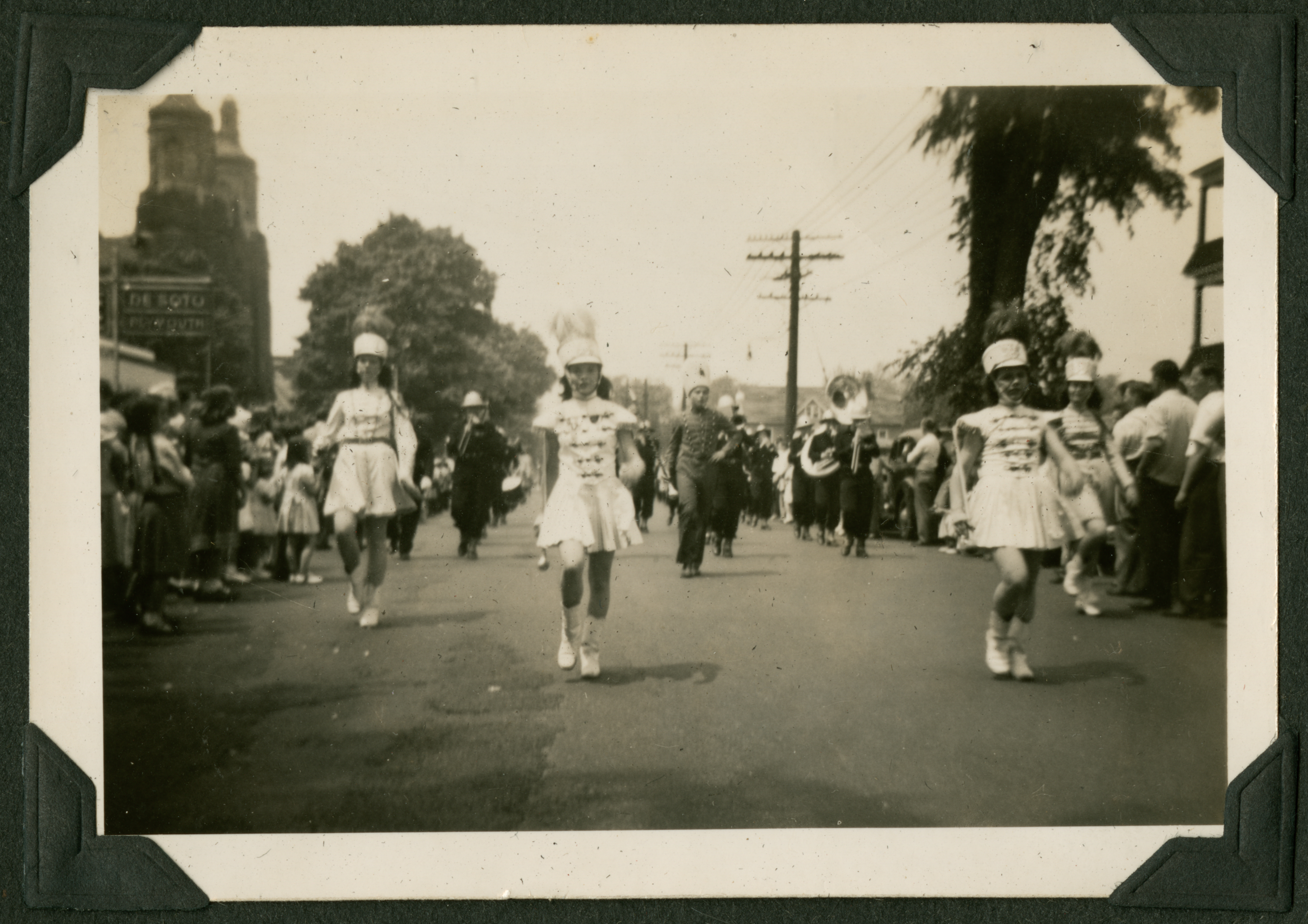 The image shows a parade. There appears to be a color guard walking down the street, towards the camera. There are crowds of people on both sides of the street. 050K is printed in black ink on the back of the photograph.