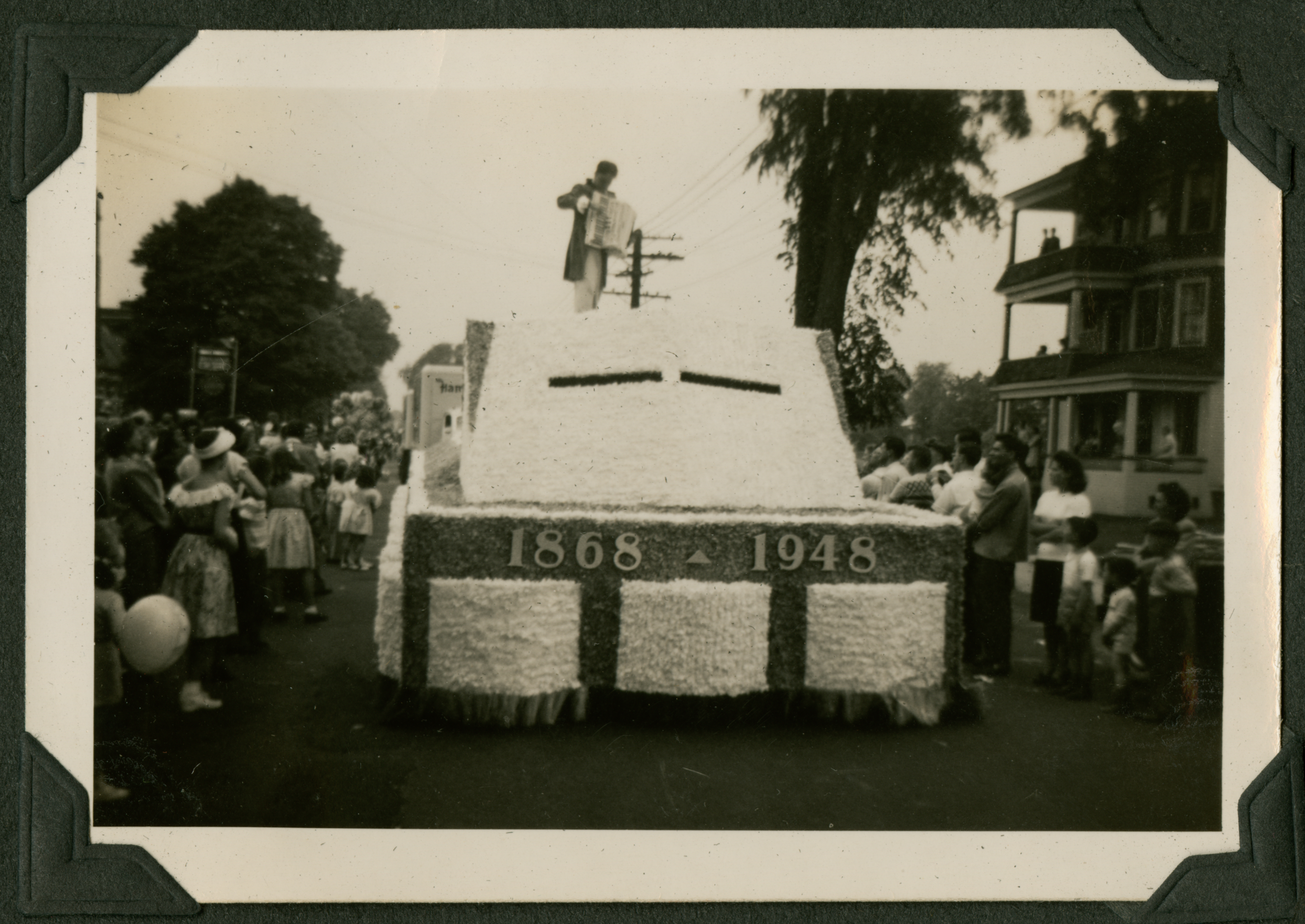 A float in the middle of the street, with crowds on either side. The front of the float says 1868-1948, and a man stands on top playing the accordion.
