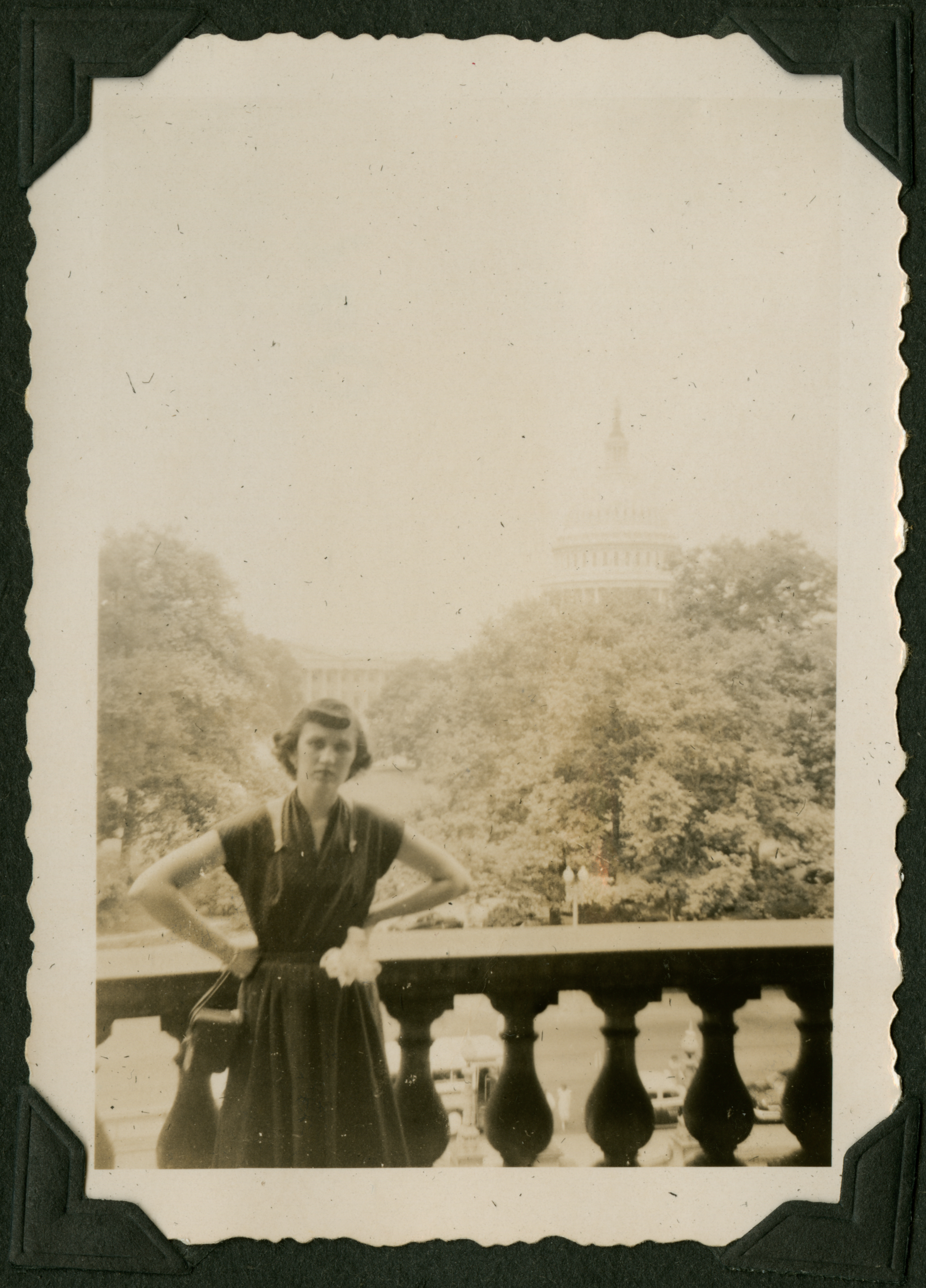 A woman in a dress stands, hands fisted and resting on her hips, on what appears to be a balcony. Trees and a few grand buildings can be seen in the background. 740 is printed in blue ink on the back of the photograph.