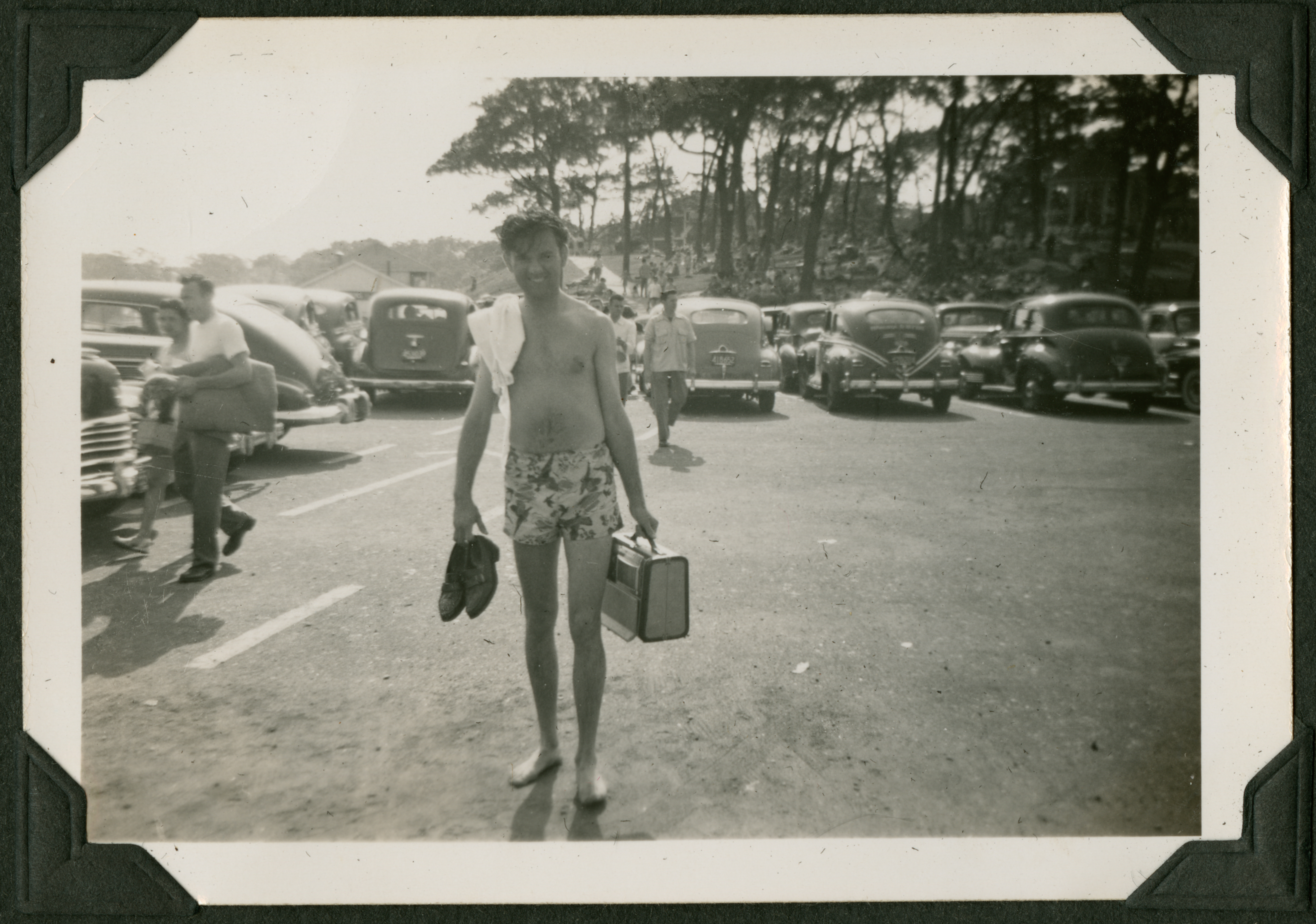 Edmund in swim shorts, holding his shoes in one hand and a portable radio box in another with a towel slung over his shoulder.