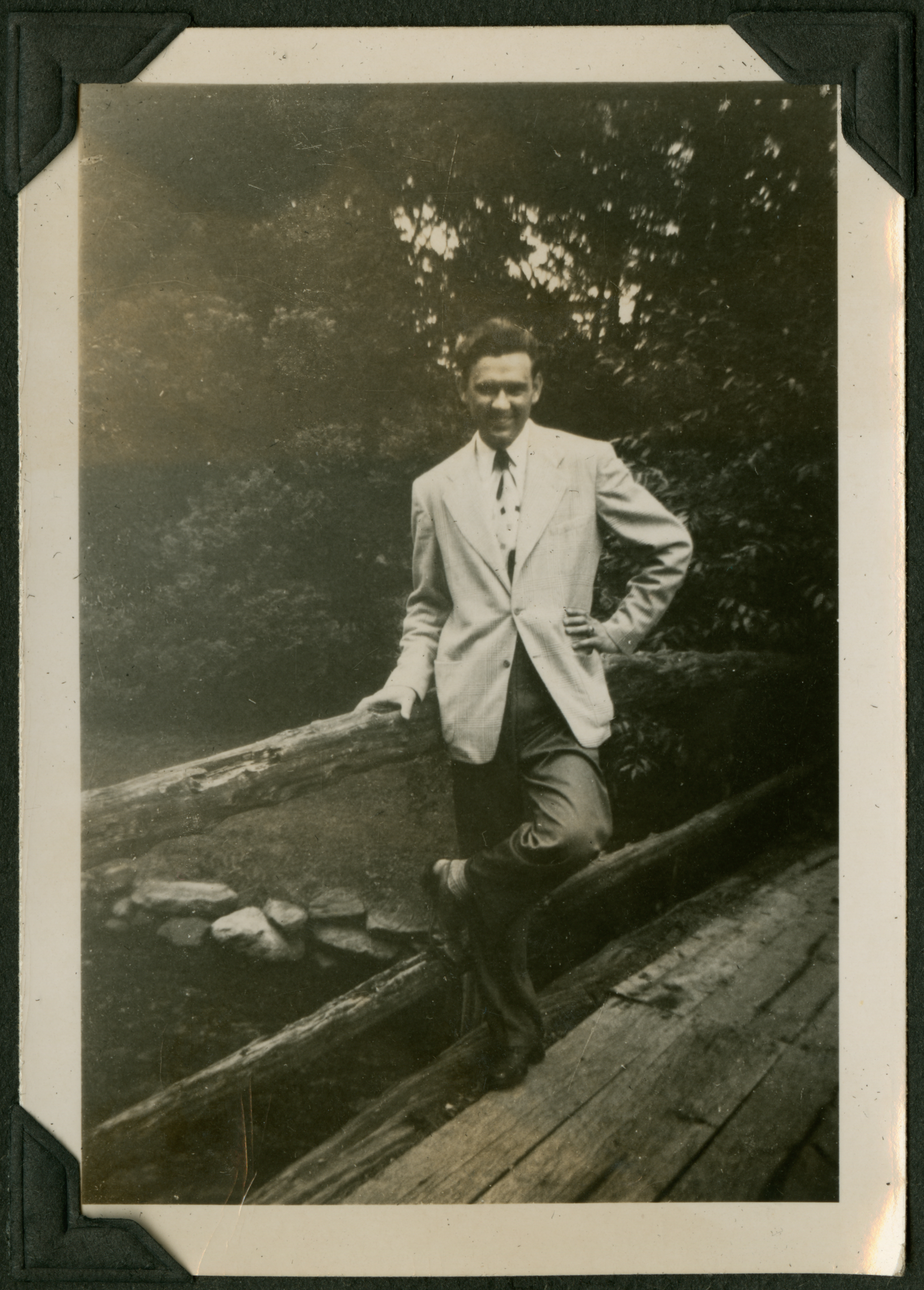 A man in a suit leans, one hand and one foot, on the rough wooden fence of a bridge. A small creek and forest are in the background. 068K is printed in black ink on the back of the photograph.