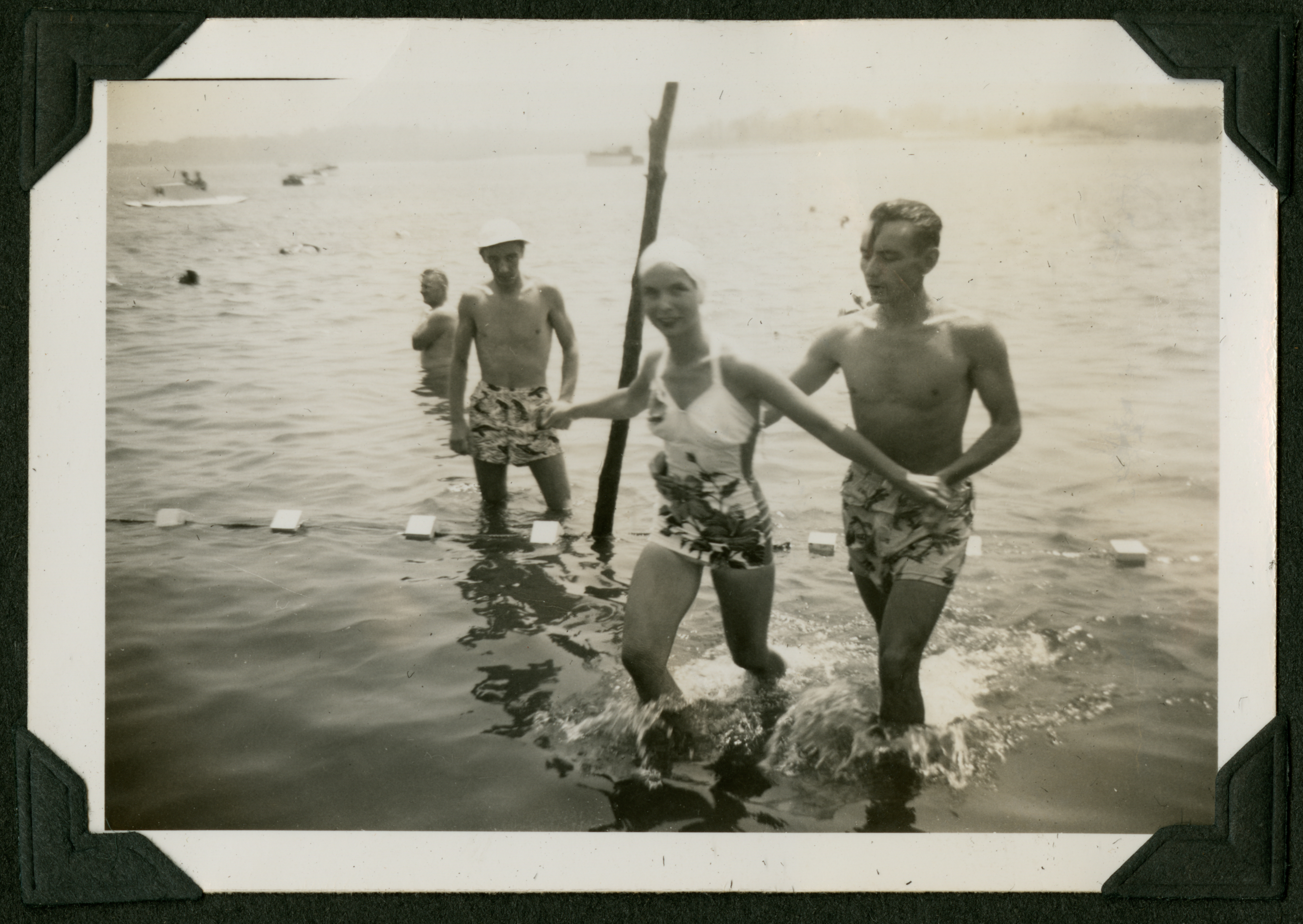 A man and woman, hand in hand, walking through shallow water on the beachfront in swim suits. A third person, a man in swim shorts and a white hat, is standing in the background near the buoys. A few others are in the water in the background. 065K is printed in black ink on the back of the photograph.