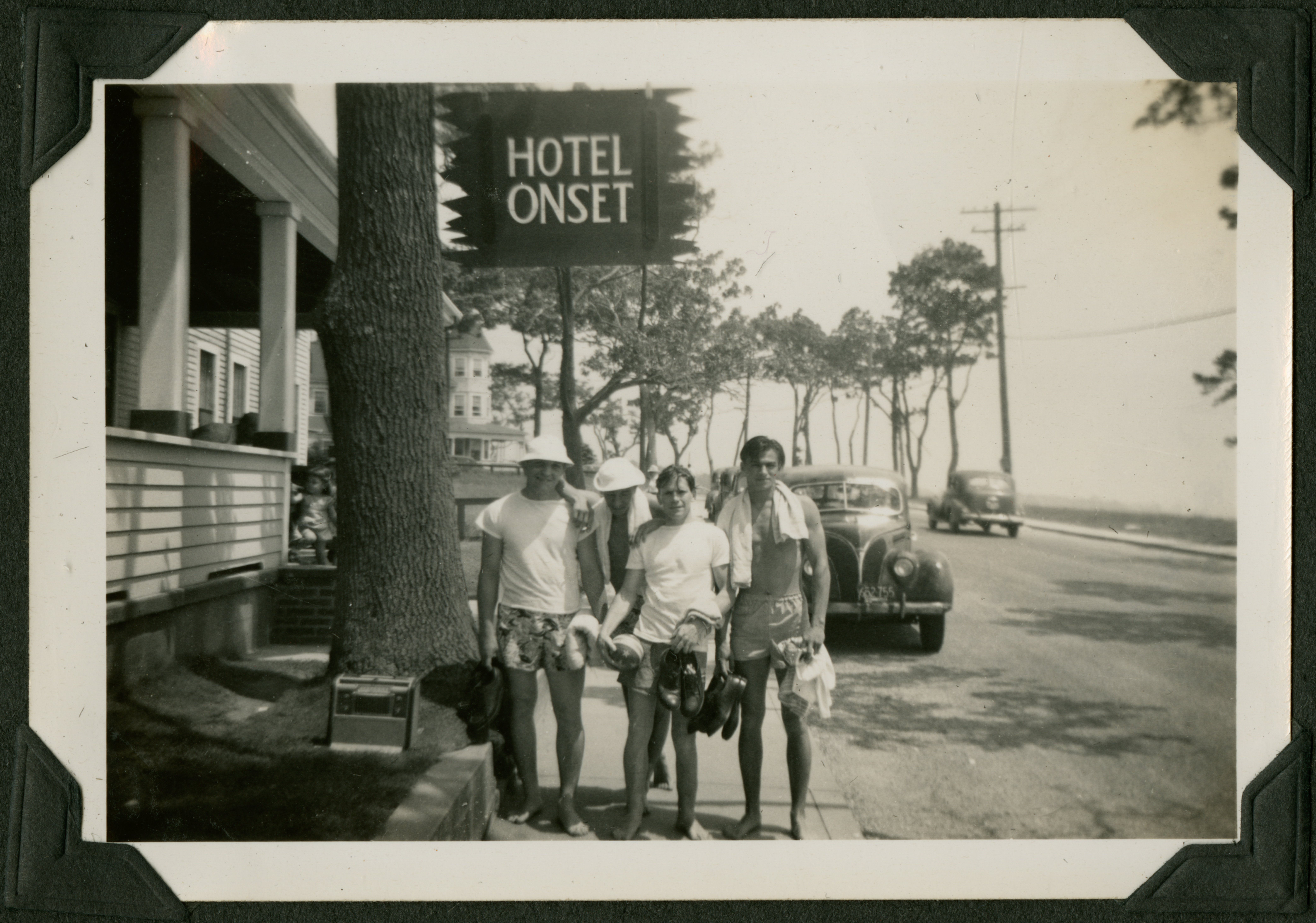 Four men walking down the sidewalk, dressed in swim shorts. They are holding their shoes. Two of them wear white t-shirts and the other two have towels wrapped around their shoulders. A sign they're walking by says "Hotel Onset." The background of the image shows cars parked on the street and trees. 065K is printed in black ink on the back of the photograph.