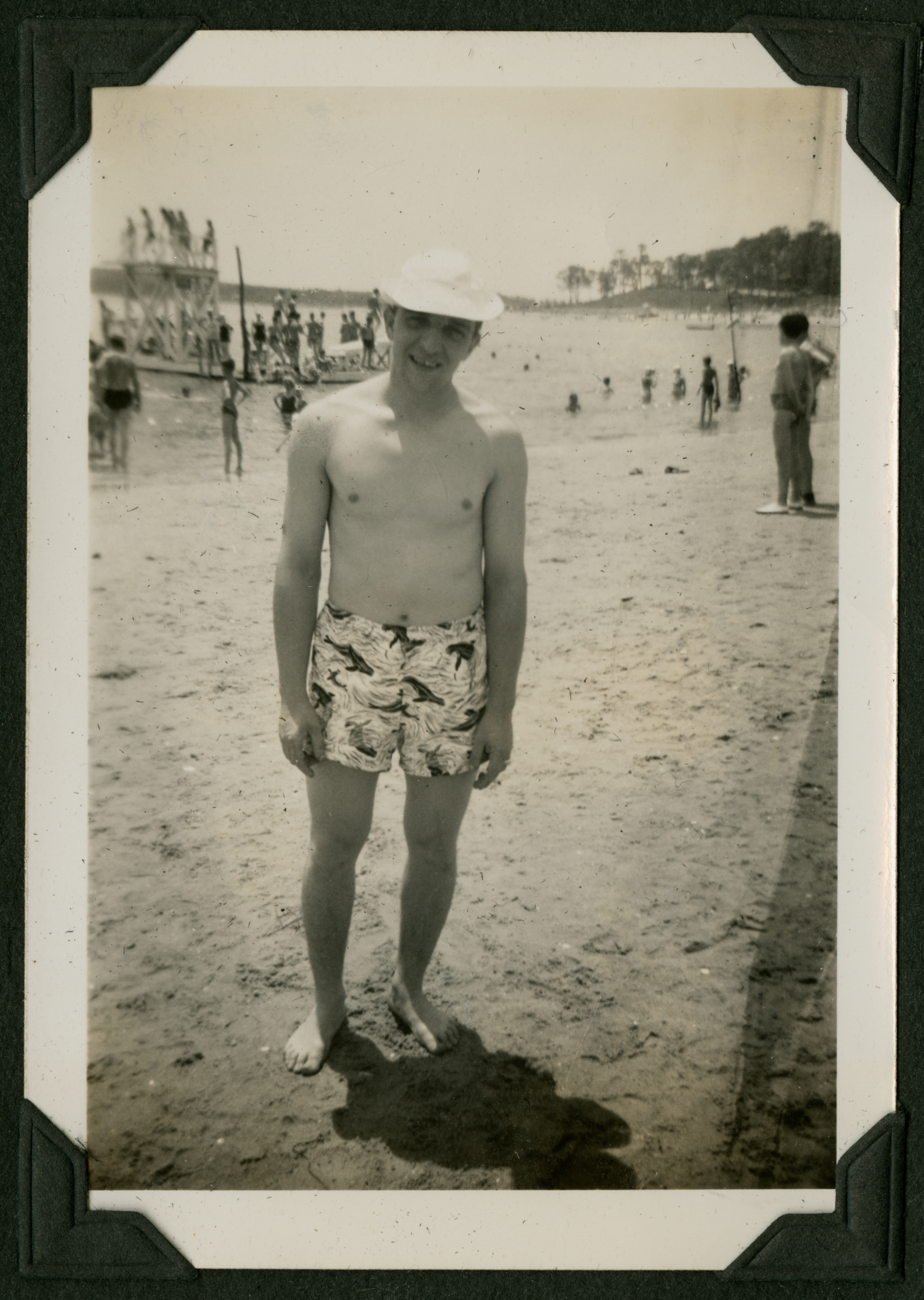A man in patterned swim shorts and a white hat standing on the beach. Other beachgoers can be seen standing, in the water, and on a deck. 065K is printed in black ink on the back of the photograph.