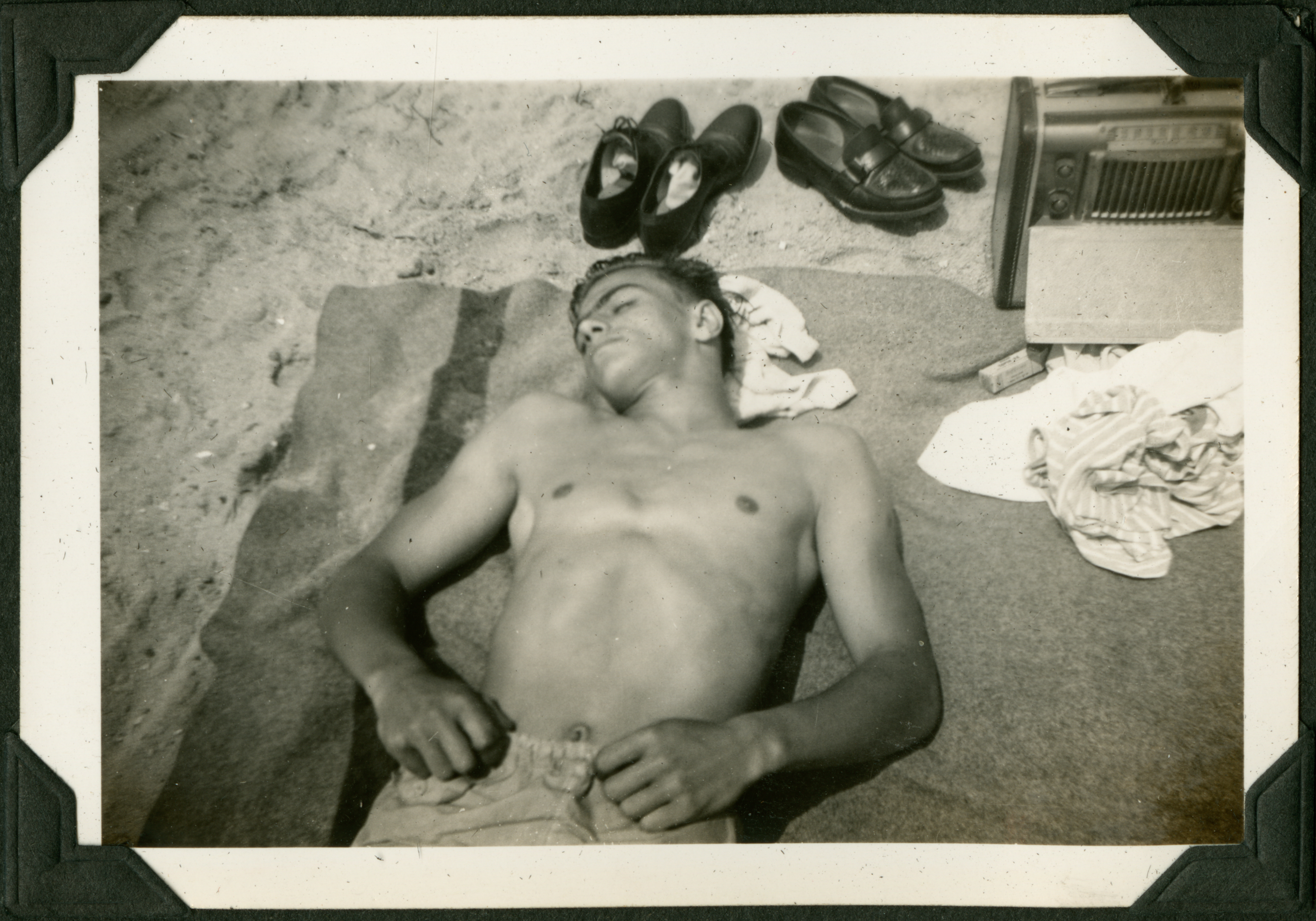 A man is shown, waist up, napping while laying on top of a towel on the beach. Shoes, shirts, and a portable radio box are strewn around him. 065K is printed in black ink on the back of the photograph.