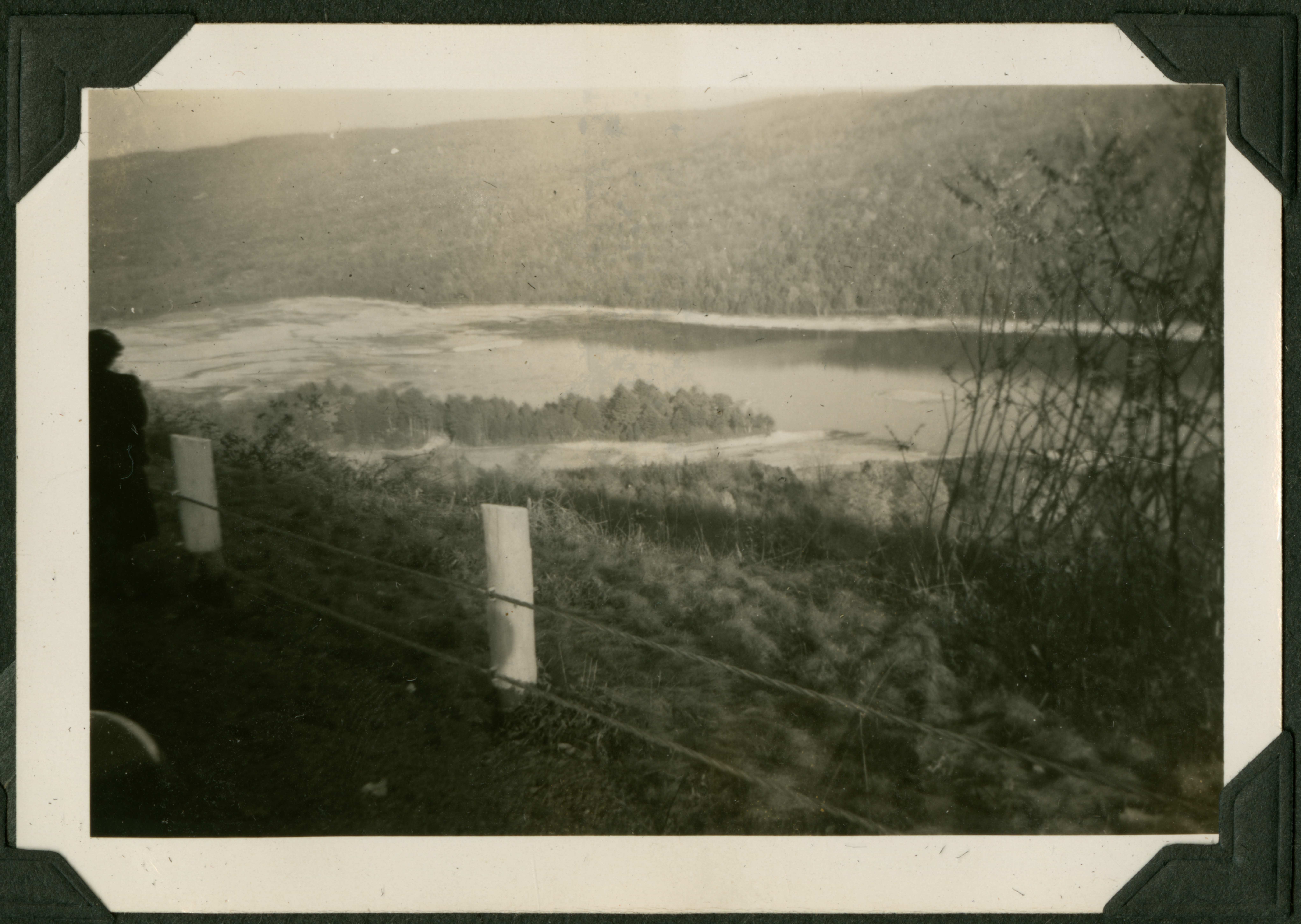 The image shows the view from a lookout point, blocked off with a roap-fence. The view below is of a body of water (a river?) surrounded by trees. 017 is printed in black ink on the back of the photograph, but this is crossed out in pencil with 009 written on above it.