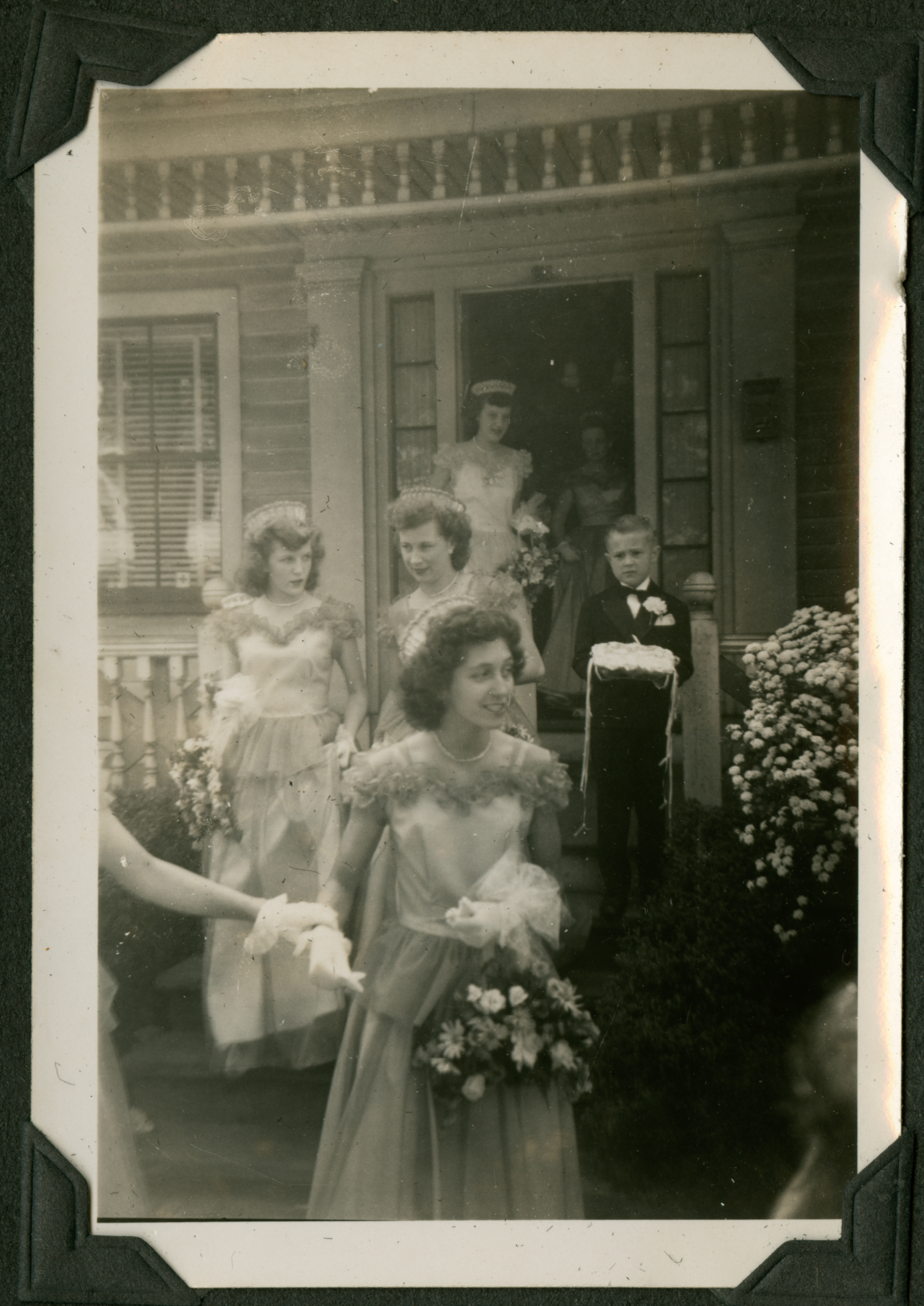 The image shows a group of five women in matching long gowns walking out the front door of a home. They appear to be the bridal party of a wedding. A young boy in a suit and holding a decorative white box stands on the porchsteps next to the women. 076 is printed in black ink on the back of the photograph, but this is crossed out in pencil with 36 written above it.