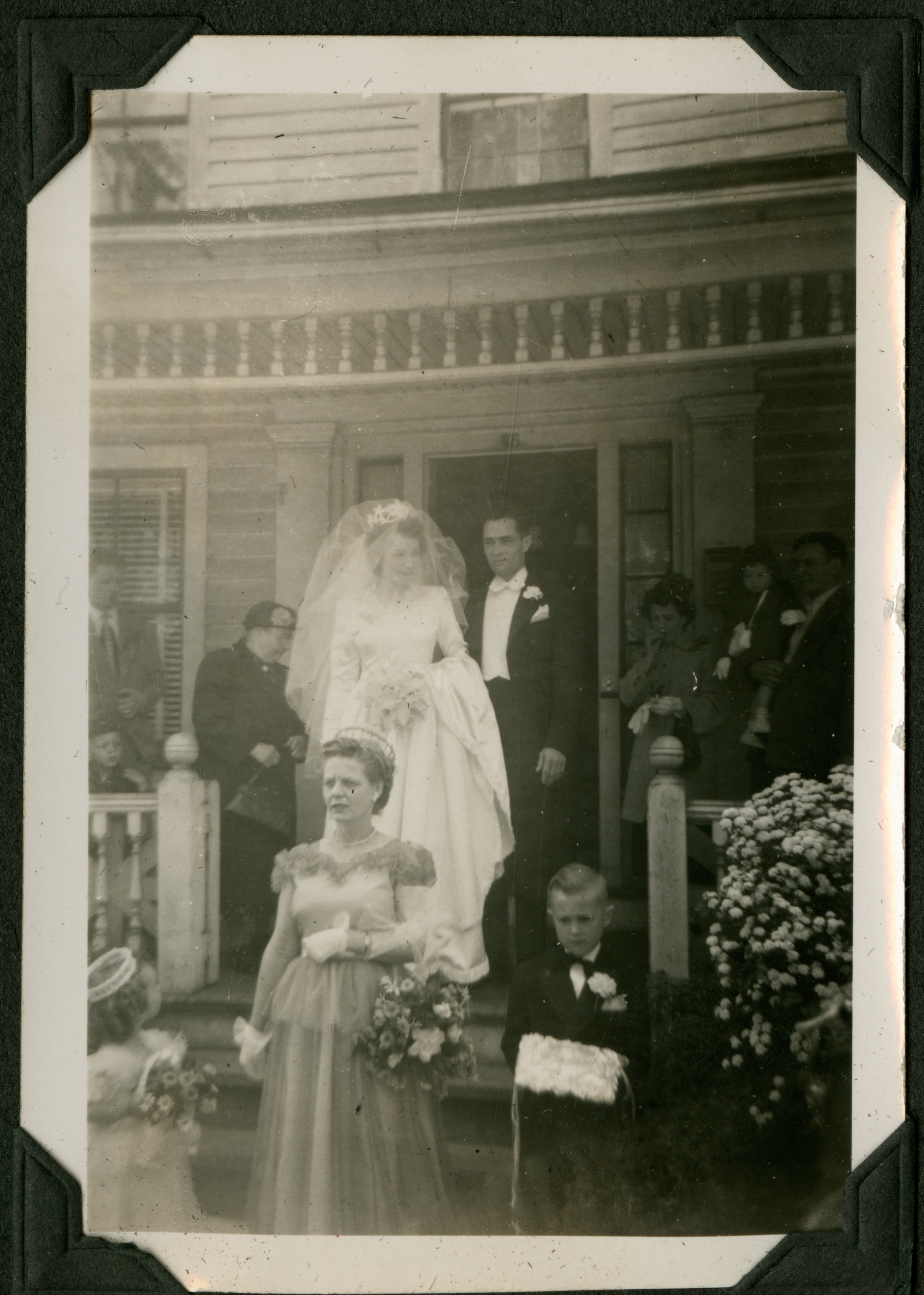 The image shows a group of people standing in on the front porch of a hosue or walking down the walkway, towards the camera. At the front is a woman in a long gown, wearing gloves and holding flowers. To her right is a young boy in a suit holding a decorative white box. To her left is young girl in a gown holding flowers. Behind her is a woman in a wedding dress and veil, walking next to a man in a suit (the groom?). Groups of people stand behind them. 076 is printed in black ink on the back of the photograph, but this is crossed out in pencil with 36 written above it.