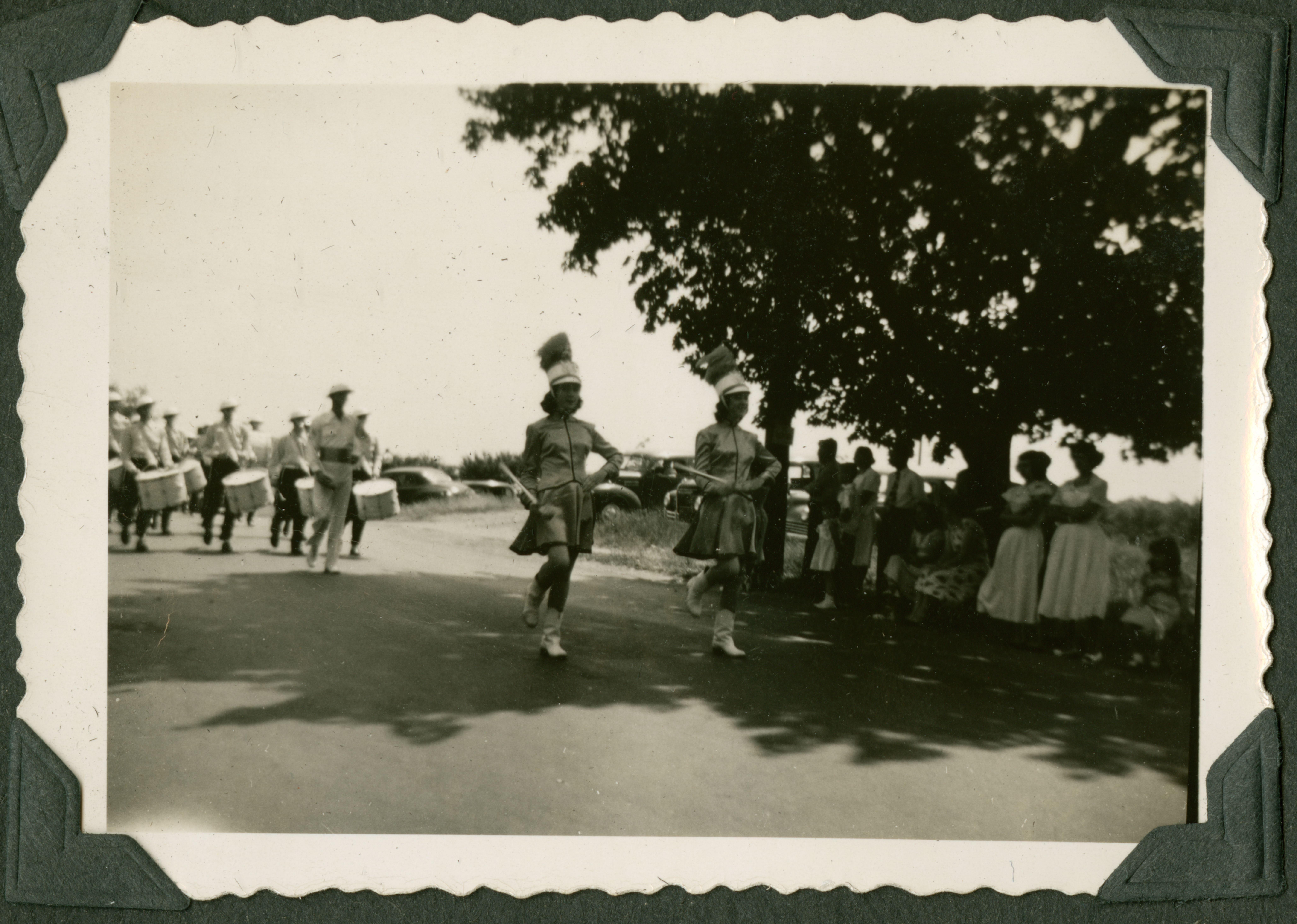 The image shows a parade. A color guard walks in front of a marching band as spectators stand on the right side of the street, under a tree. 227 is printed in blue ink on the back of the photograph.