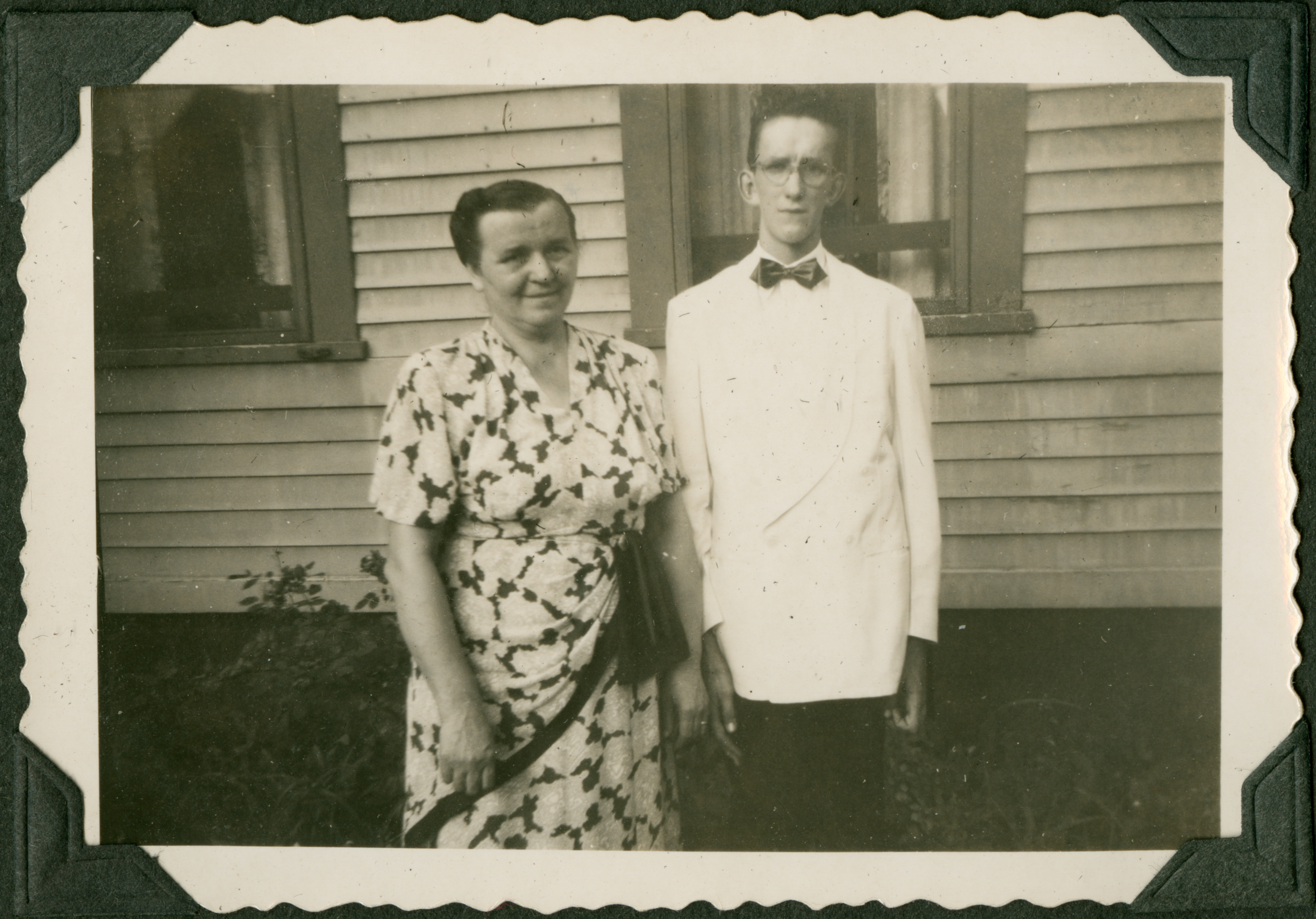The image shows a man and a woman standing outside in front of the side of the house. The woman (left) wears a patterned dress and has her hair pulled back. The man (Edmund, right) has his arms straight by his sides and is wearing a white jacket and shirt, dark bowtie, and glasses. 227 is printed in blue ink on the back of the photograph.