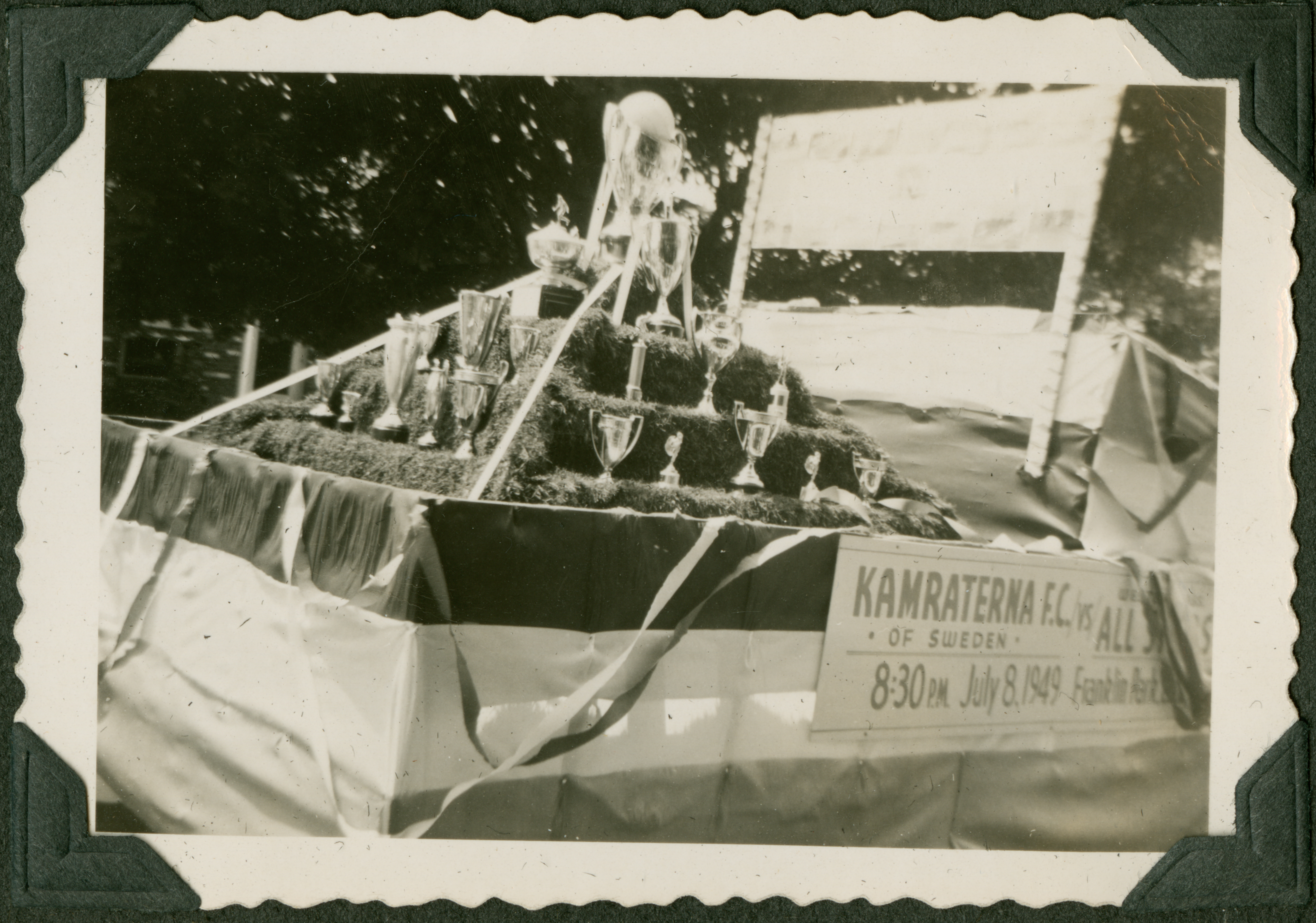 The image shows the back of a parade float, with several bales of hay and several trophies attached to them. The sign on the side of the float reads "Kamraterna F.C. of Sweden vs. [indeciperhable]. 8:30 P.M. July 8 1949." 227 is printed in blue ink on the back of the photograph.