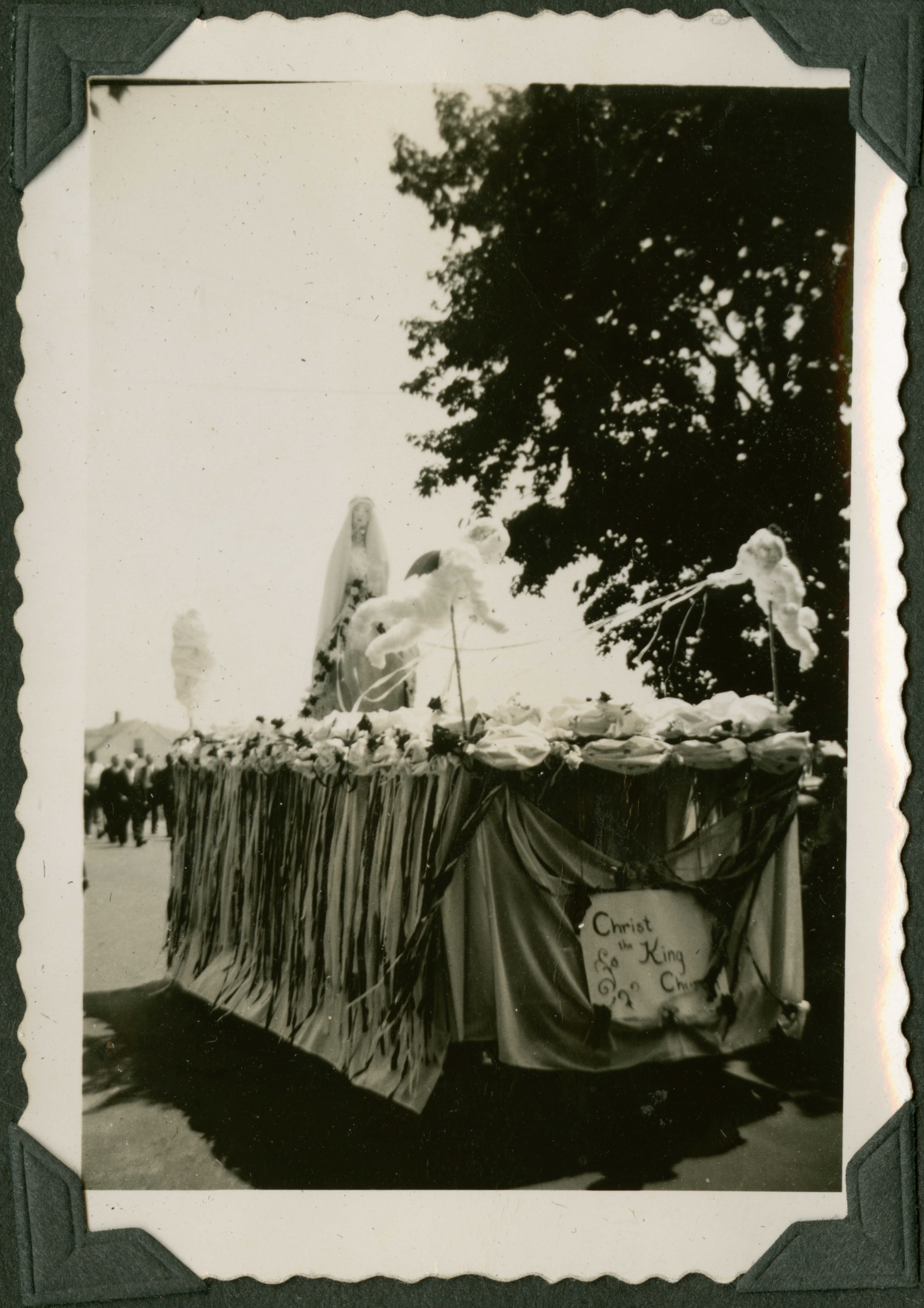 The image shows part of a parade. The focus is on a parade float decorated with paper mache cherubs, and what seems to be a paper mache Mary. A border of flowers is on the edge of the float. The front of the float has a sign that reads, "Christ the King Church." 227 is printed in blue ink on the back of the photograph. Christ the King Church in Ludlow was founded in 1948.