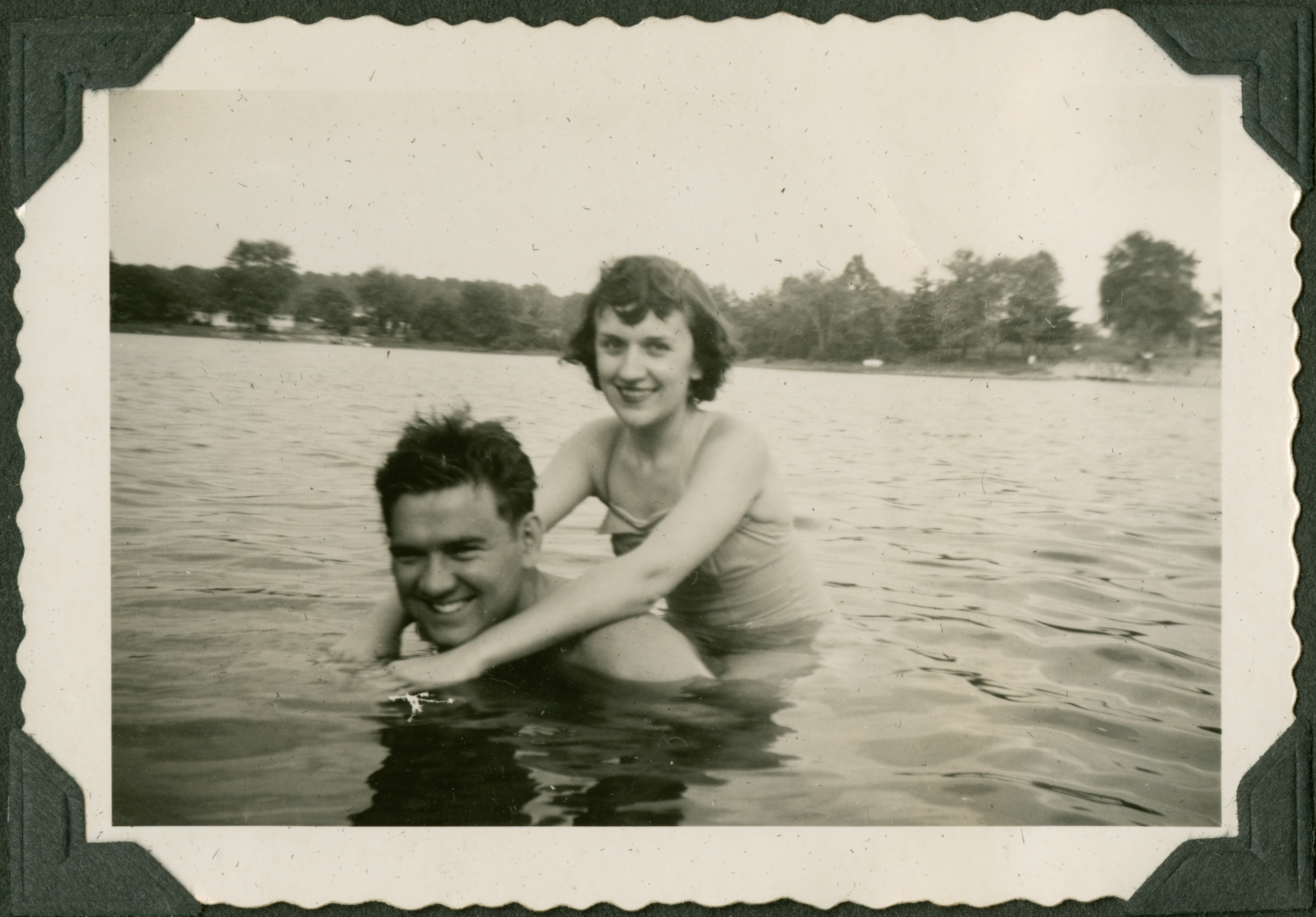 A man (Edmund), seen from shoulders up, in a body of water with a woman in a swimsuit hanging onto his back, arms around his neck. They both smile towards the camera. A shoreline with trees behind it can be seen in the distance. 066 is printed in blue ink on the back of the photograph.