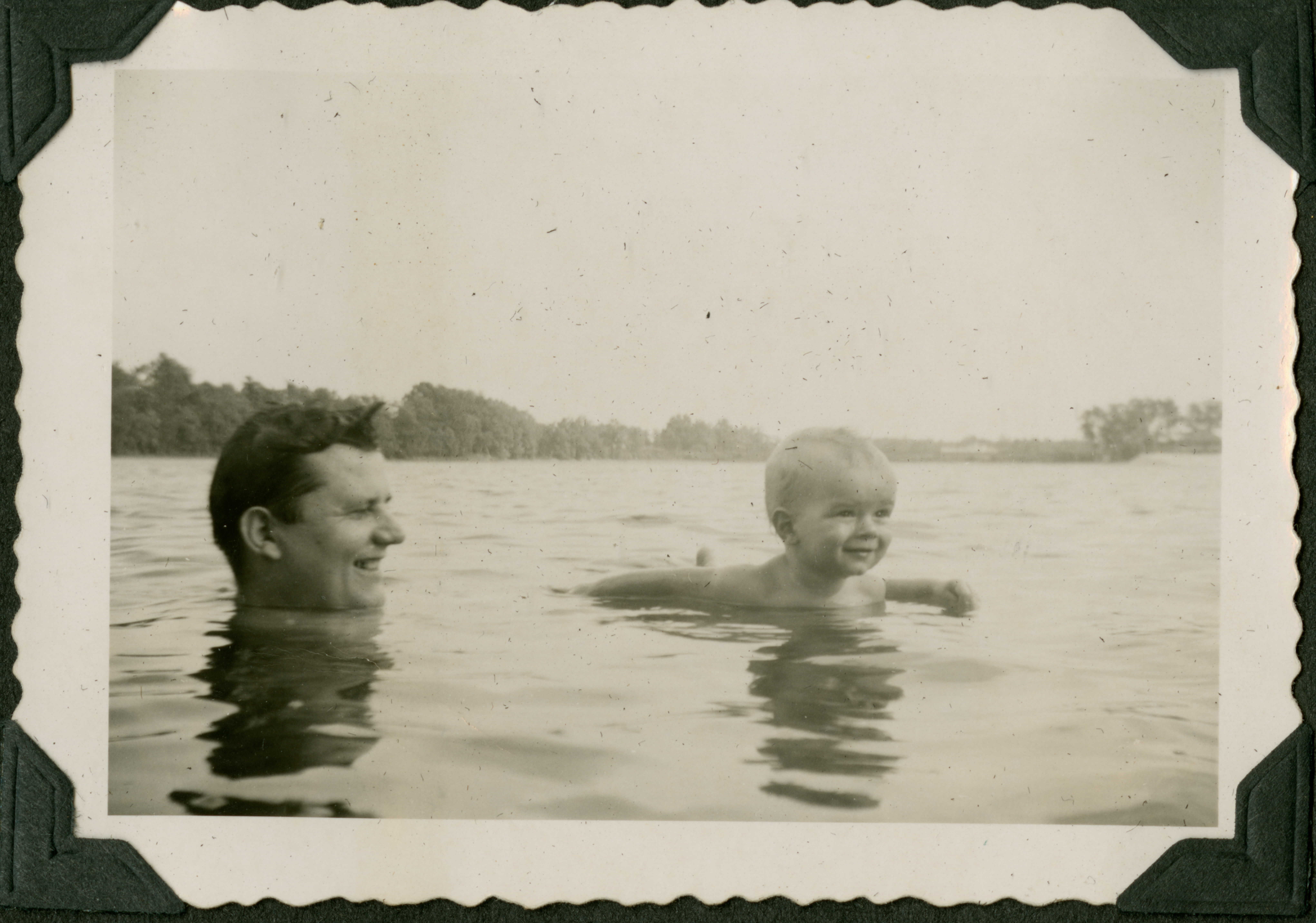 A man and a baby playing in a body of water. Both can be seen from their head up, and the baby has their arms outstretched. A shoreline with trees behind it can be seen in the distance. 066 is printed in blue ink on the back of the photograph.