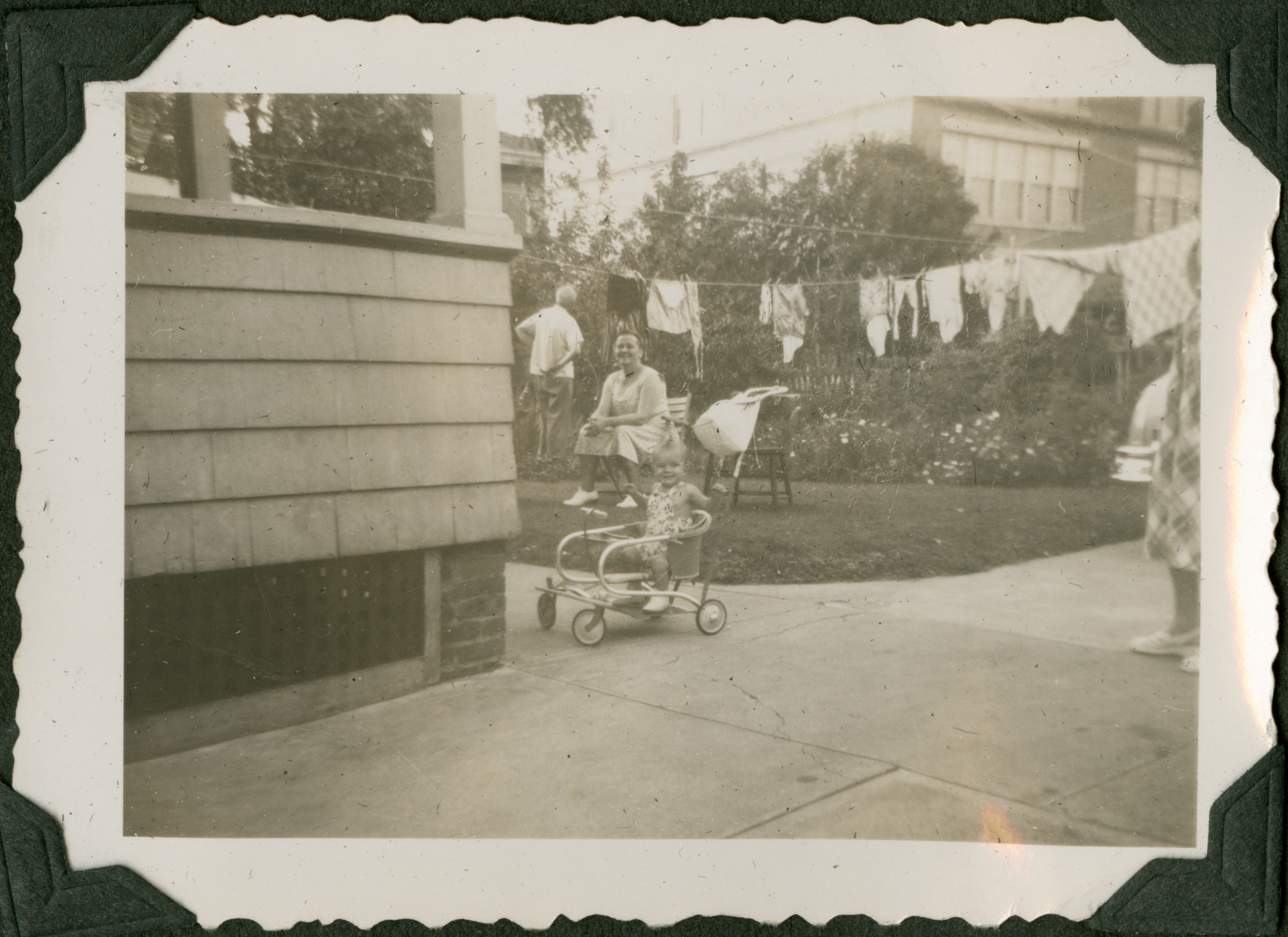 The image shows a corner of a house and its backyard. Clothes are hanging from a clothesline across the yard. There are several figures in the yard. One man is standing, back towards the camera, hands on his hips, in the back corner of the yard. One woman is sitting on a chair, hands rested on her knees, smiling towards the camera. A baby in a stroller or wagon looks towards the camera, arms up, and one more person is cut off in the right side of the photograph. 721 is printed in blue ink on the back of the photograph.