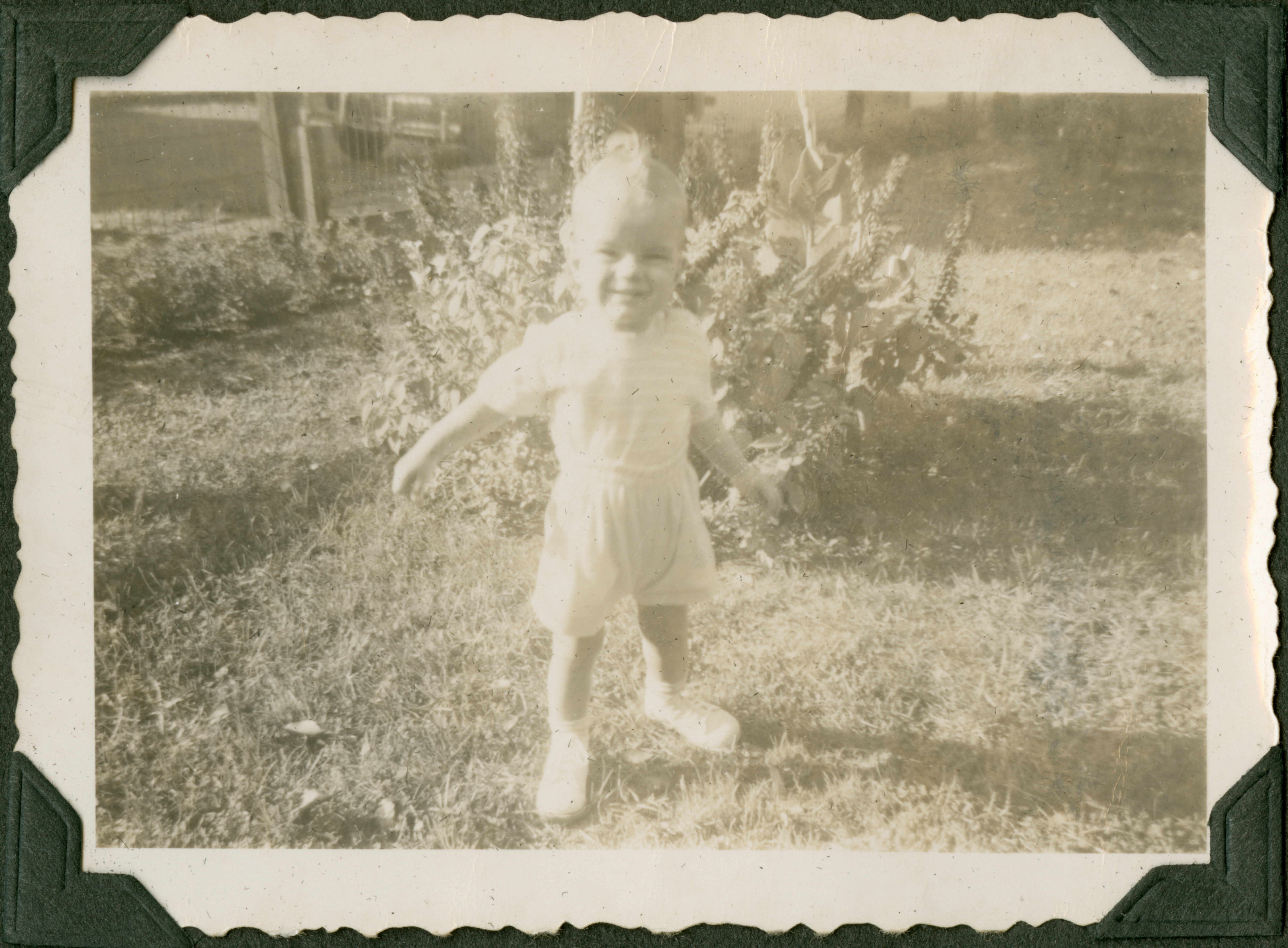 A baby in a striped shirt and shorts stands, arms outstretched, in front of a bush. They appear to be in a back or front yard of a house, as a fence can be seen in the background. 779 is printed in blue ink on the back of the photograph.
