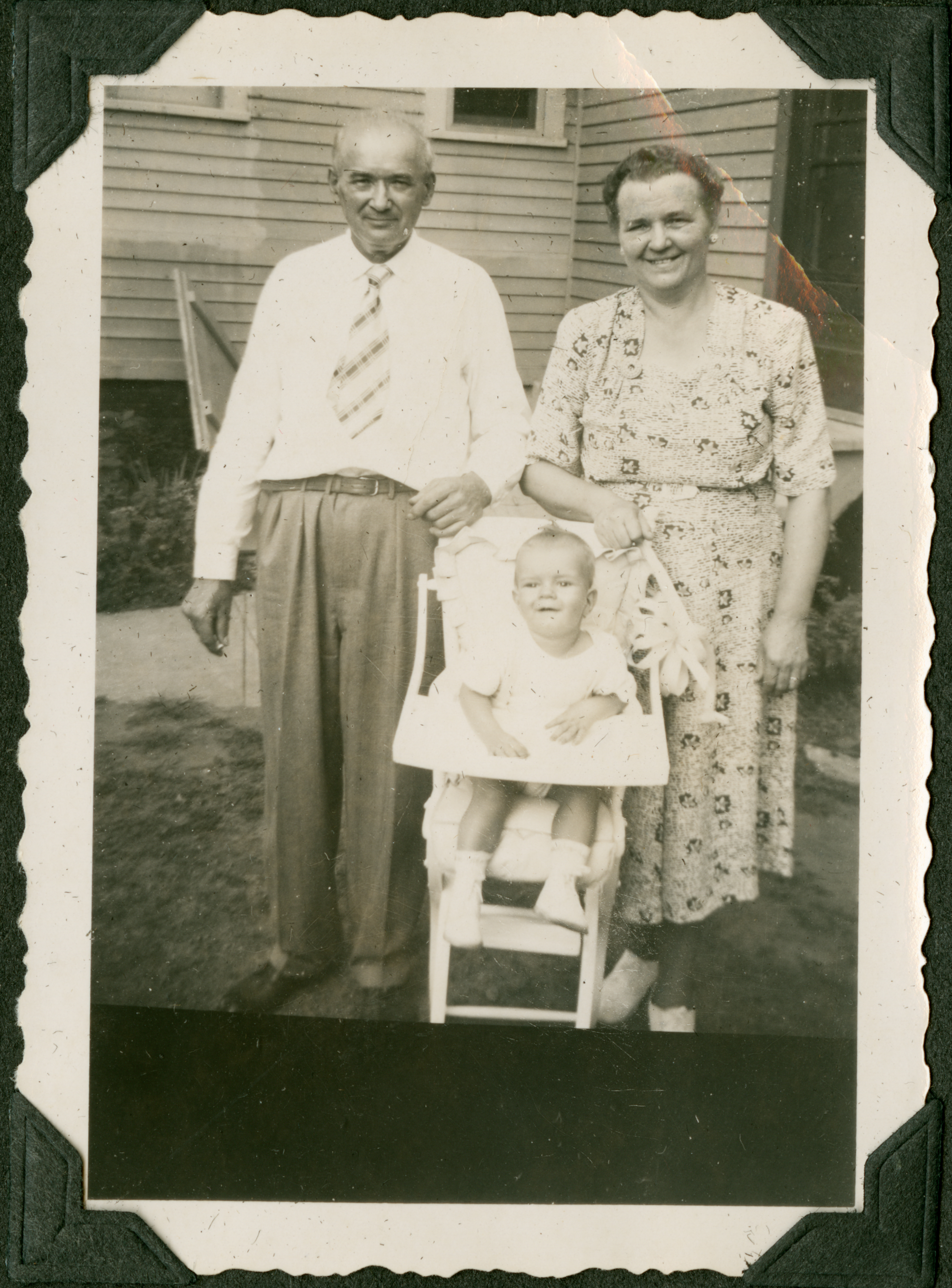 An older man and woman standing outside of a house, with a baby in a high chair between them. The man is wearing suit pants, a white collared shirt, and tie, and the woman is wearing a long floral dress. They both rest one arm on the baby's high chair.