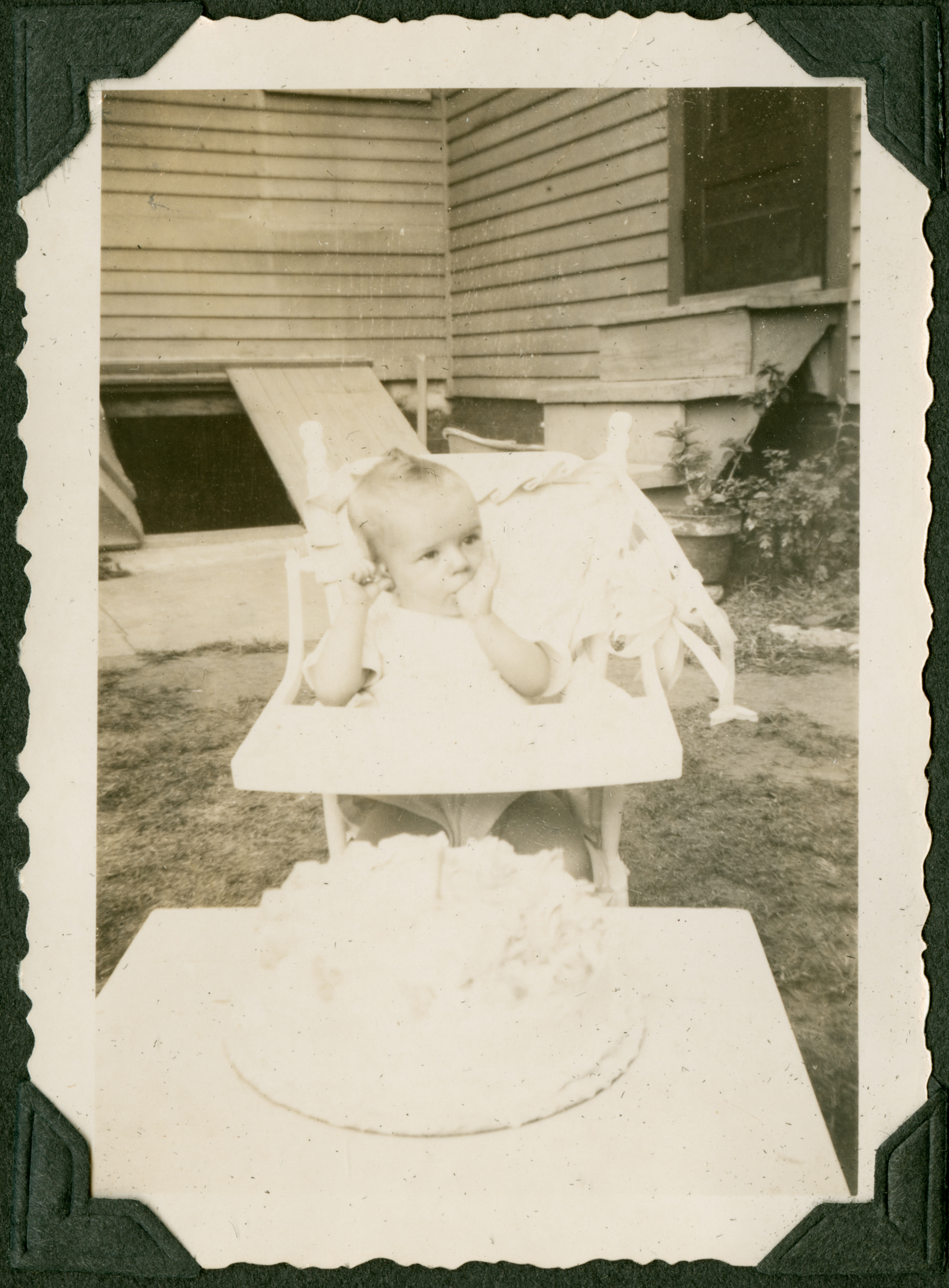 A baby in a high chair with a table and a cake in front of them. The photograph is taken from outside, likely in the backyard of a house based on the open cellar doors of a house in the background.