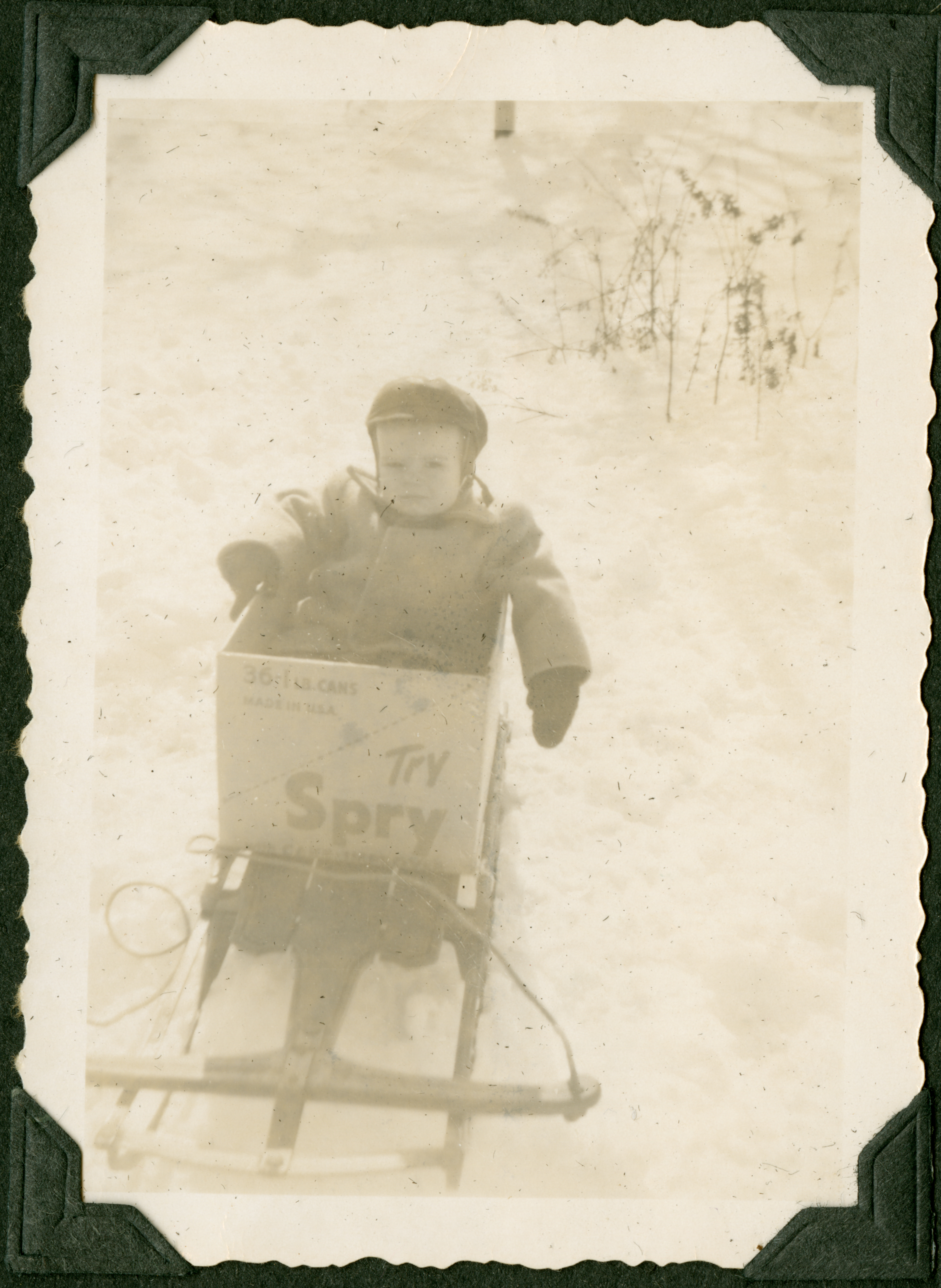 A toddler, bundled up in a winter coat, hood, and mittens, sitting in a box on a sled outside in the snow. The box says "36-LB Cans Made in USA. Try Spry." 779 is printed in blue ink on the back of the photograph.