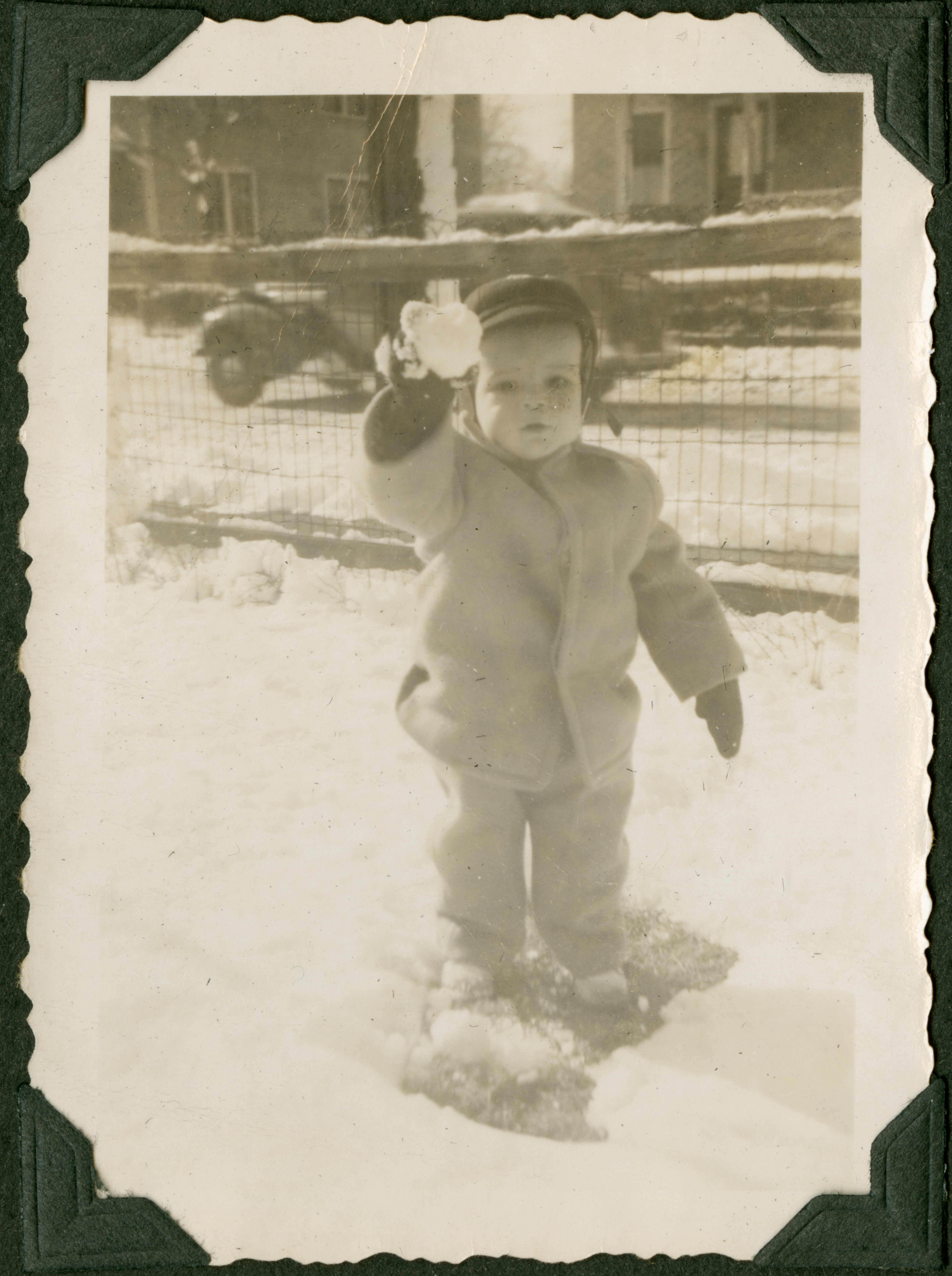 A toddler, bundled up in a winter coat, hood, and mittens standing outside in the snow, holding up a snowball. A fence, street, and houses can be seen in the background. 779 is printed in blue ink on the back of the photograph.