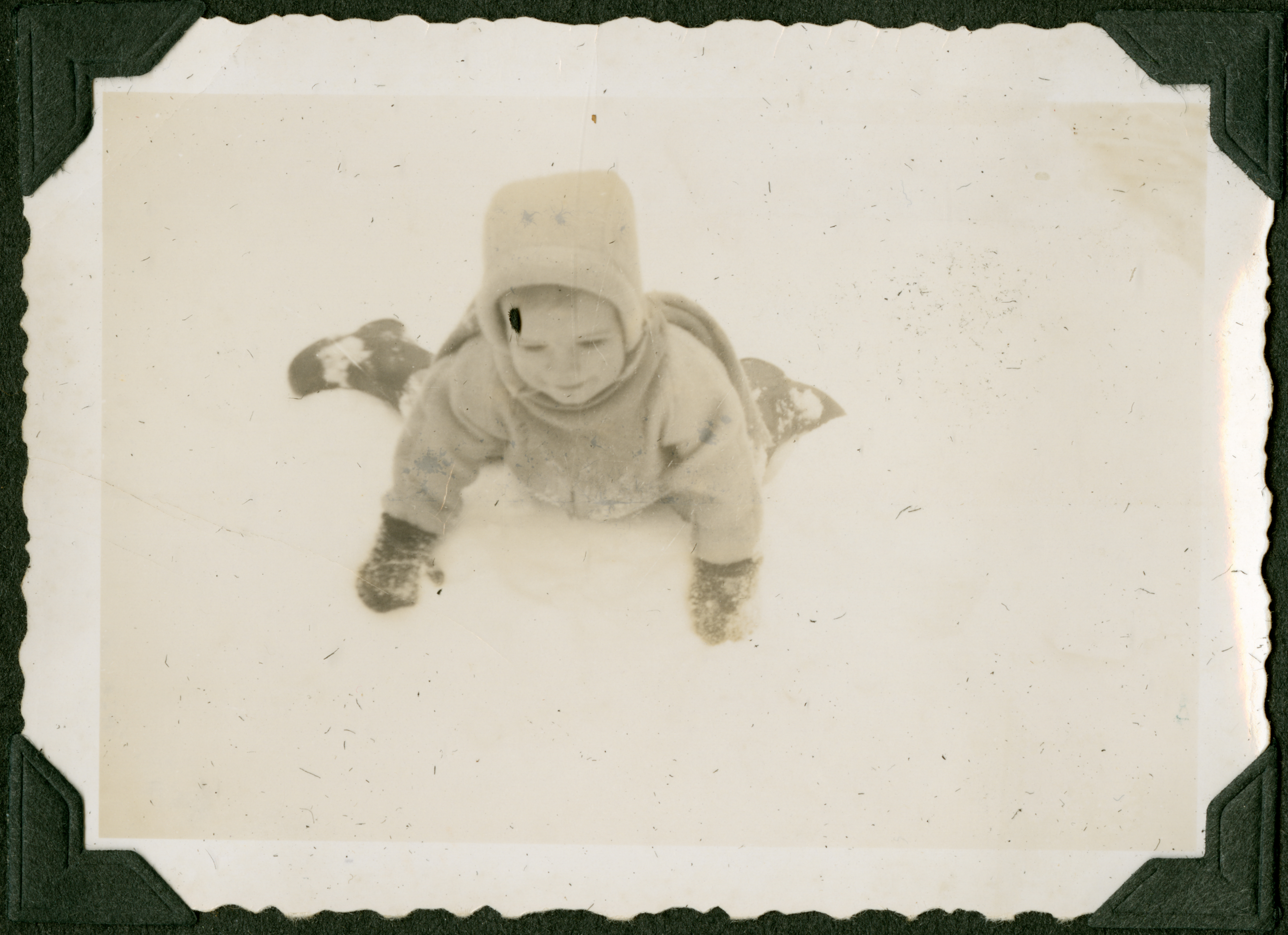 A child bundled up in a winter hoat, hood, and mittens laying on their front in the snow. The is looking down owards the ground. 751 is printed in blue ink on the back of the photograph.