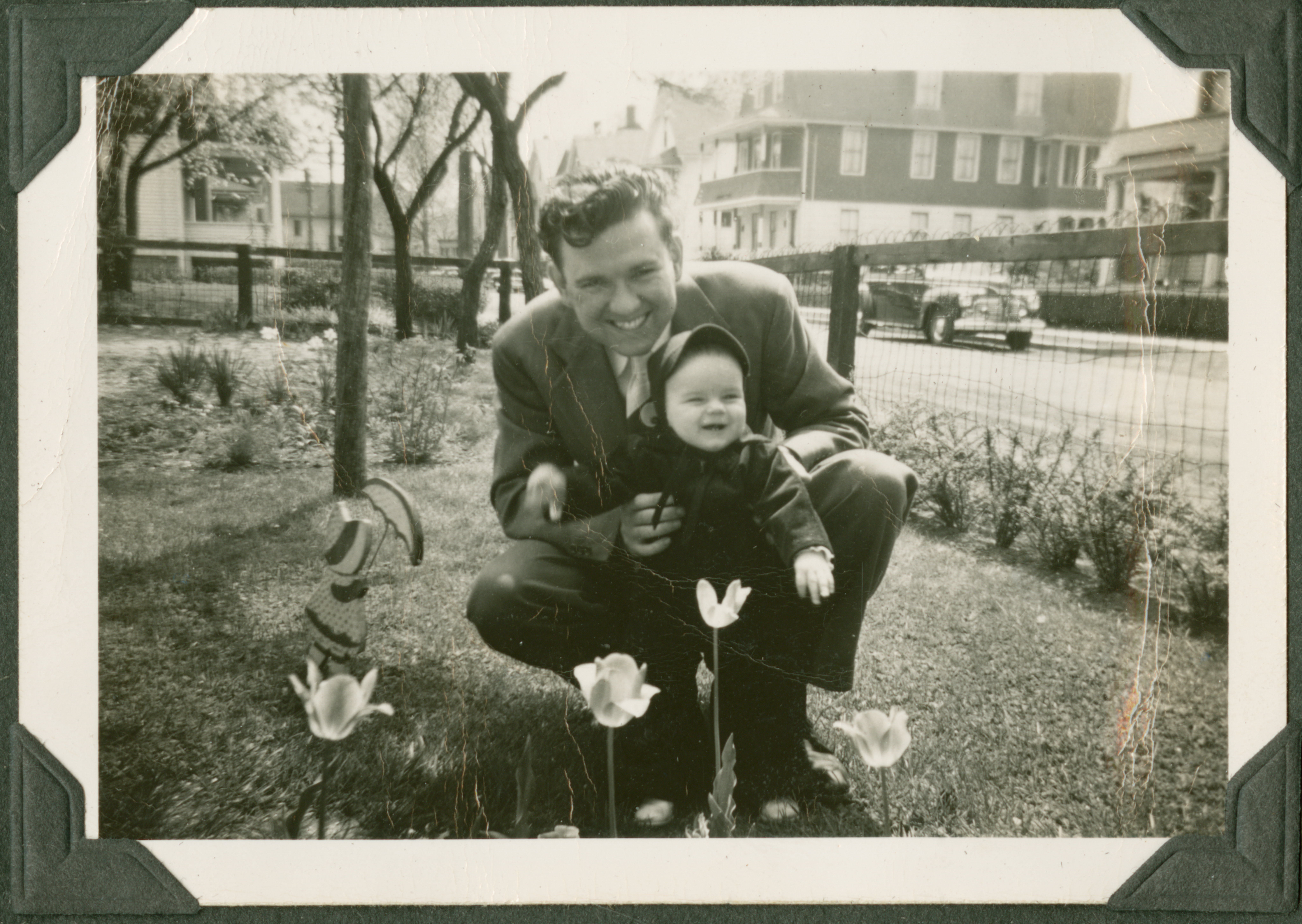 The image shows a man in a suit (Edmund), smiling towards the camera as he is crouched down on the ground, holding up a baby in a dark, thick outfit and hat. They are crouched in front of some flowers in what appears to be a front yard, as there are houses and a street in the background. 037 is printed in black ink on the back of the photograph.