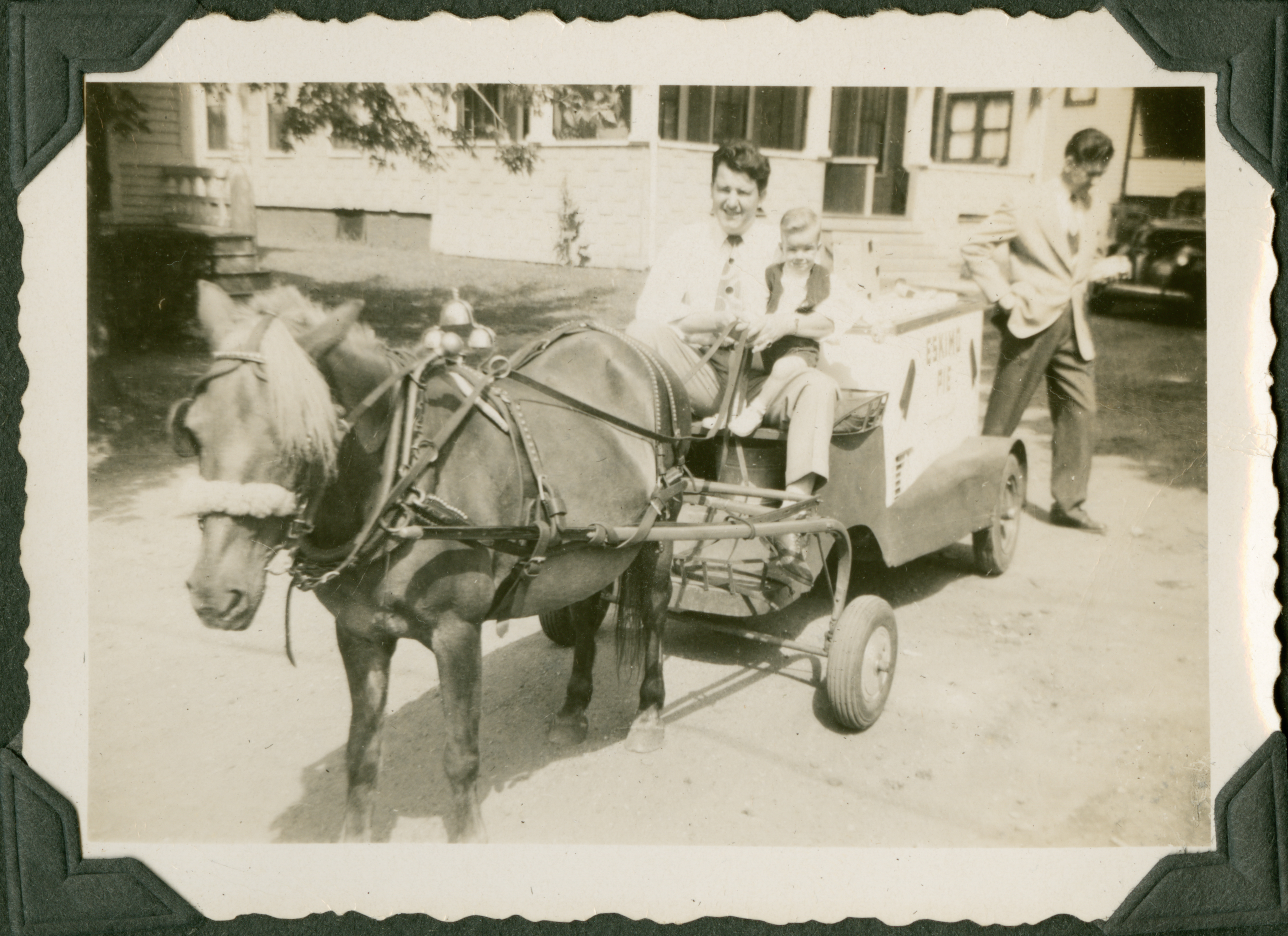 A man in a white shirt and tie sits in the back of a single-horse-drawn cart, with his arm wrapped around a child. Another man (seemingly Edmund) in a suit stands in the background behind the cart. The cart says "Eskimo Pie" on the side. 743 is printed in blue ink on the back of the photograph.
