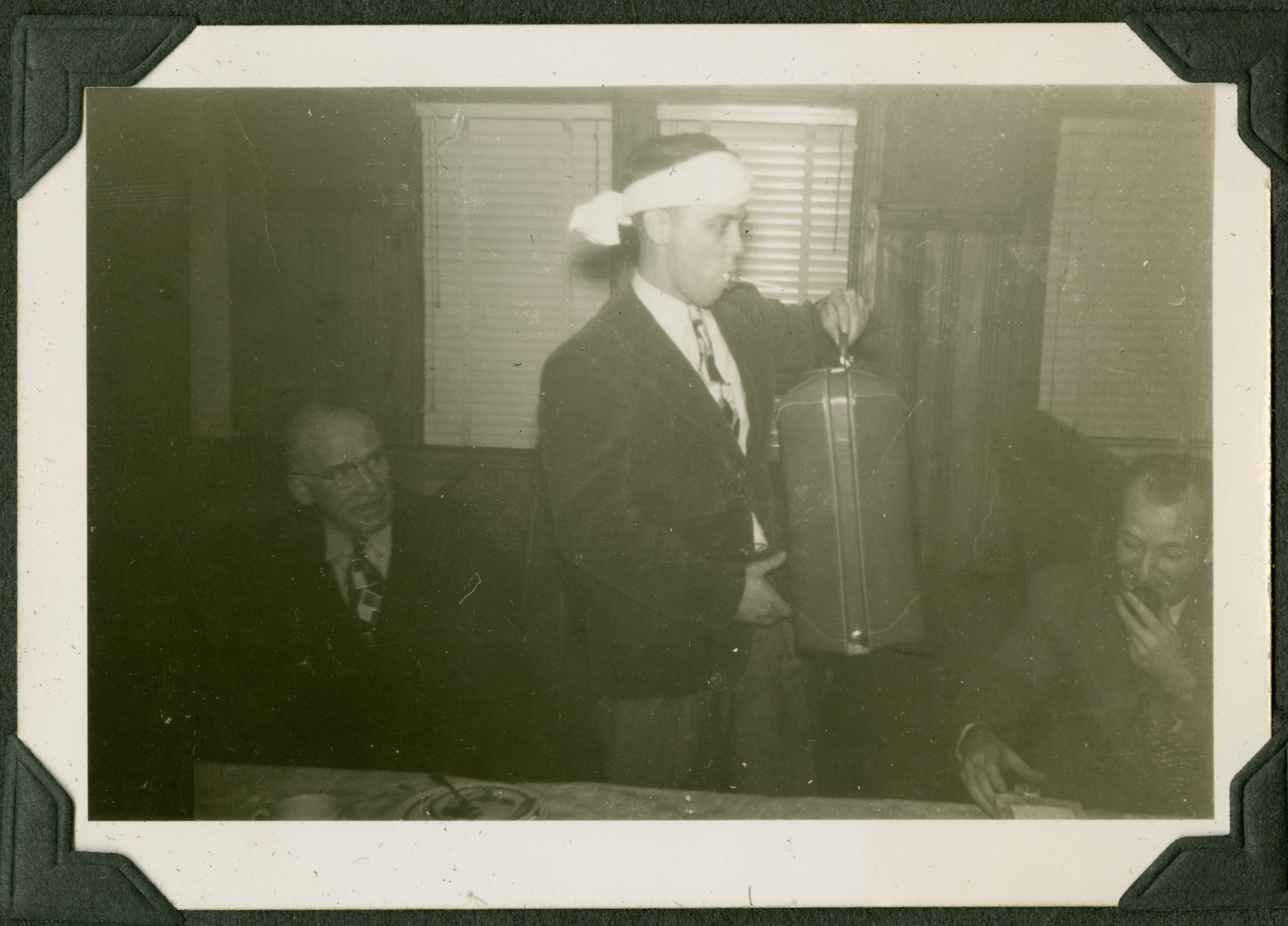 The image shows a man in a suit with a white headband tied around his foreheard looking to the side and holding what appears to be a suitcase. He also appears to have a lollipop in his mouth. Two other men in suits sit on either side of him. The one on the right appears to be laughing as he raises something towards his mouth, potentially to eat. 062 is printed in black ink on the back of the photograph. The number 2 is written in pencil on the side of the back