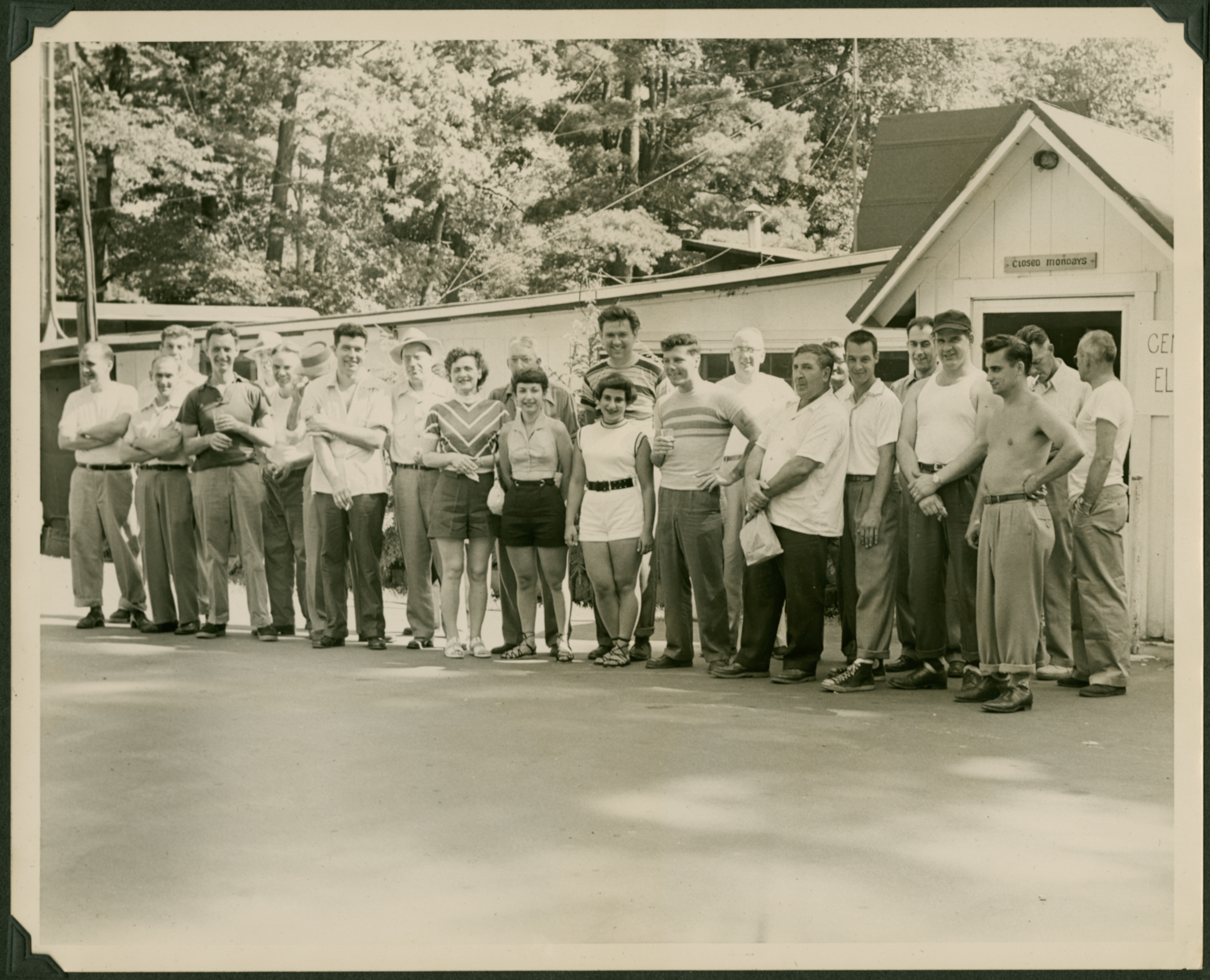 The image shows 24 men and women standing outside a building in what appears to be a wooded area. Most are wearing casual clothing and are smiling at the camera. Edmund is standing in the center of the photograph in a striped shirt. The sign above the door of the building in the background says, "Closed Mondays." A sign on the building to the right is cut off, but "CE-- EL--" can be seen. The back of the photograph is stamped with "William Askwith 75 Dwight St. Springfield, Mass." Askwith was a Springfield resident who served in World War II alongside Edmund.