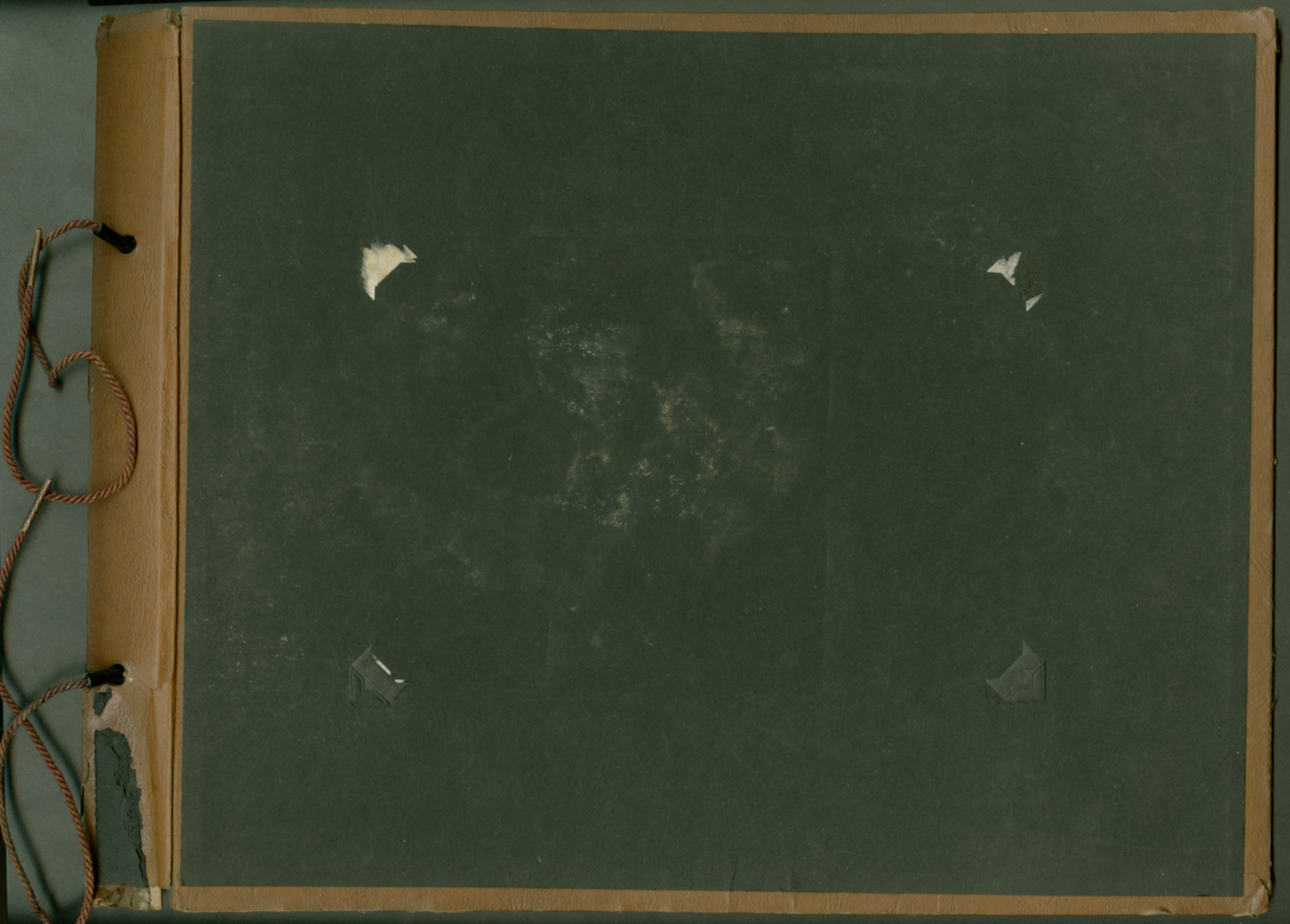 Inside back cover of brown leather scrapbook; black paste-downs with what looks like old mildew stains. There are 2 black photo corners and the marks where 2 more used to be, but whatever was held there has been removed.