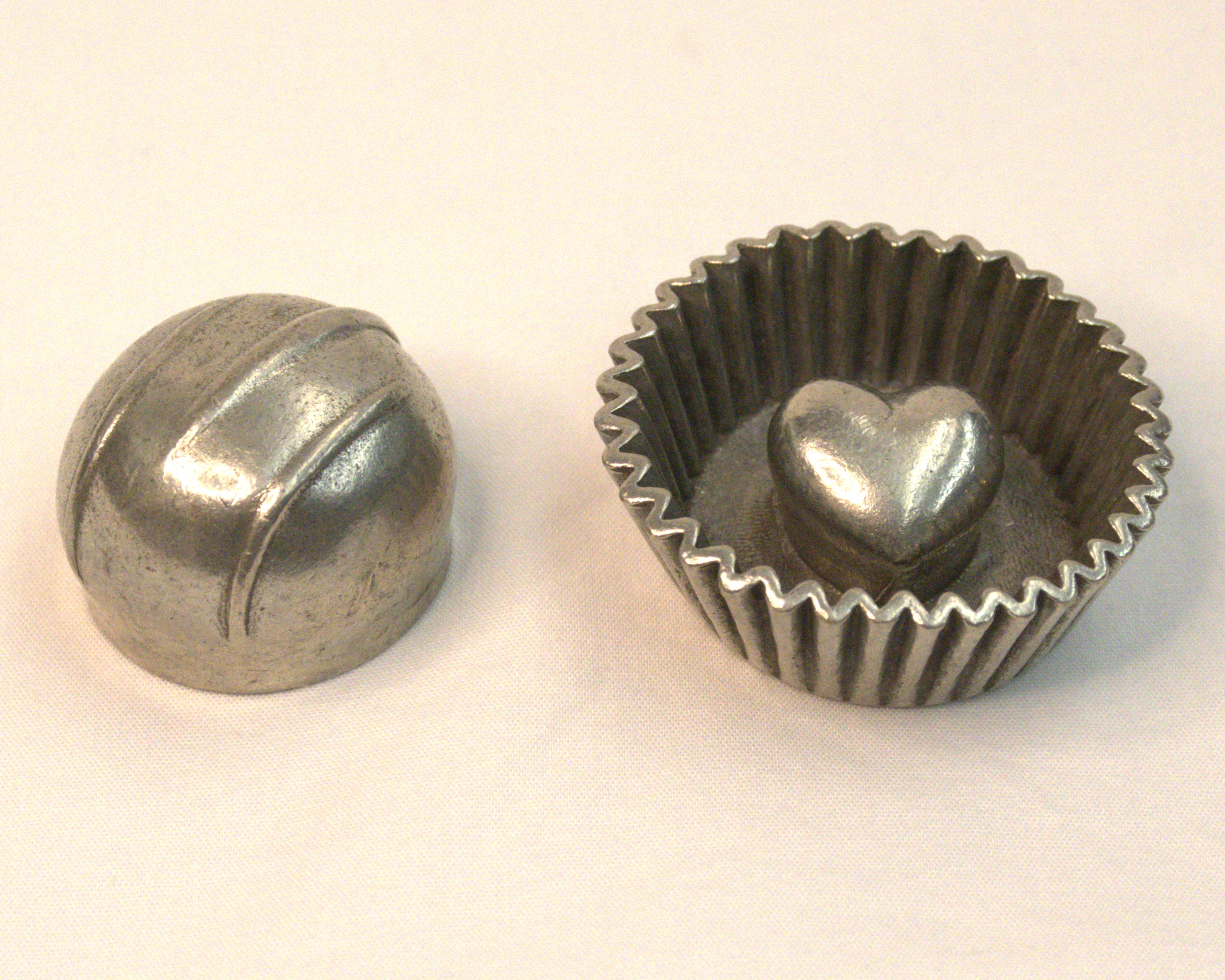 [A small metal truffle, the top removed to show a heart nested in the lower half.]