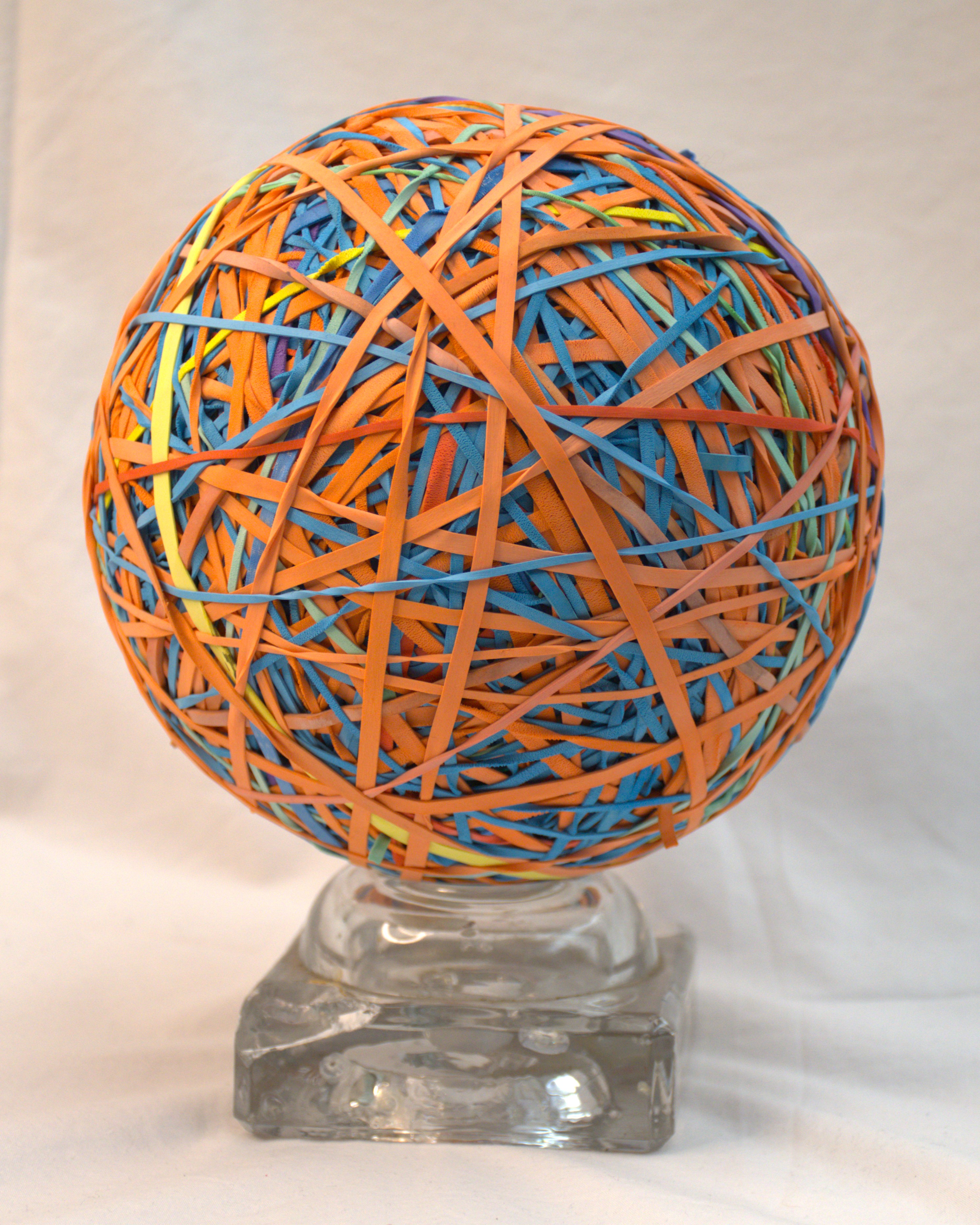[A very large, multicolored rubber band ball sitting atop a clear square base.]