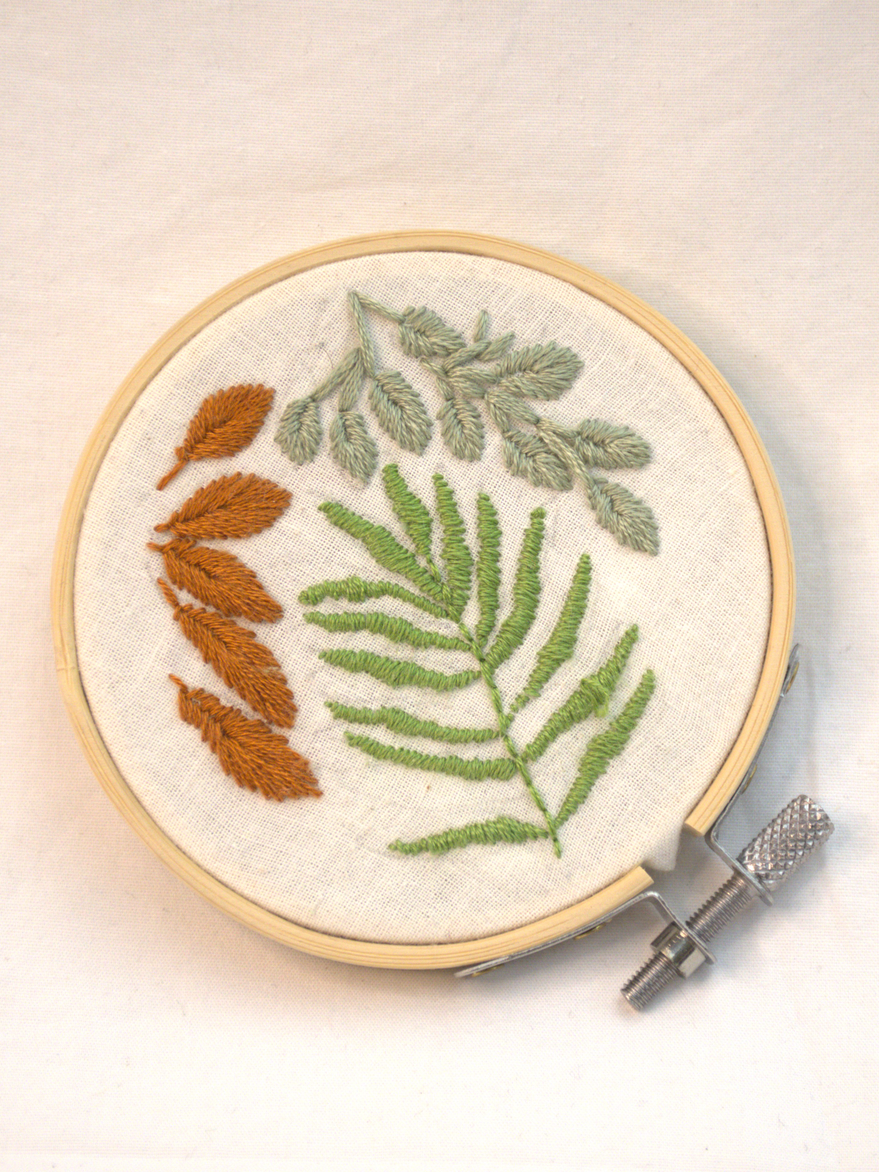 [A small embroidery hoop with embroidered images of a fern, an unspecified plant, and some autumn leaves.]